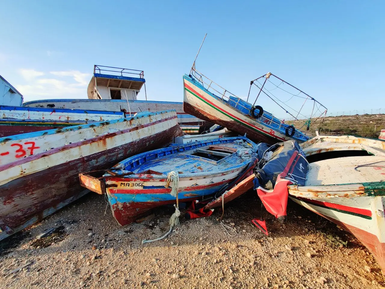 E lá estão os barcos sobre as planícies rochosas. E o sol inclemente do sul sobre todas as coisas. O caminho para o cemitério de barcos é feito através de uma antiga base militar norte-americana - está aberta mas é vigiada. De um lado e de outro da estrada, dissimulados em pilhas de estilhaços, estão centenas de barcos de madeira, outros de borracha que agora são fiapos pretos e cor-de-laranja espalhados pelo chão. Veem-se camisolas, cobertores, dezenas de coletes salva-vidas, chinelos, sapatilhas, brinquedos sujos de terra. Dez minutos depois de chegarmos, um militar italiano pede-nos que abandonemos o local.