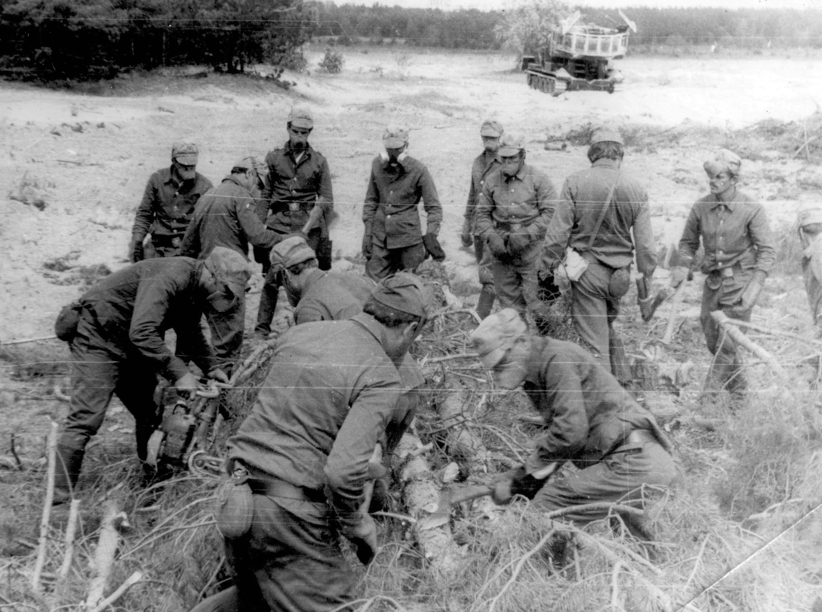 Para eliminar as consequências da catástrofe, eram necessárias muitas mãos. Para isso, foram mobilizados para o nosso regimento reservistas: homens jovens e robustos, com idades entre os 23 e os 40 anos. Os soldados não eram químicos nem especialistas em descontaminação: eram, acima de tudo, força de trabalho física.