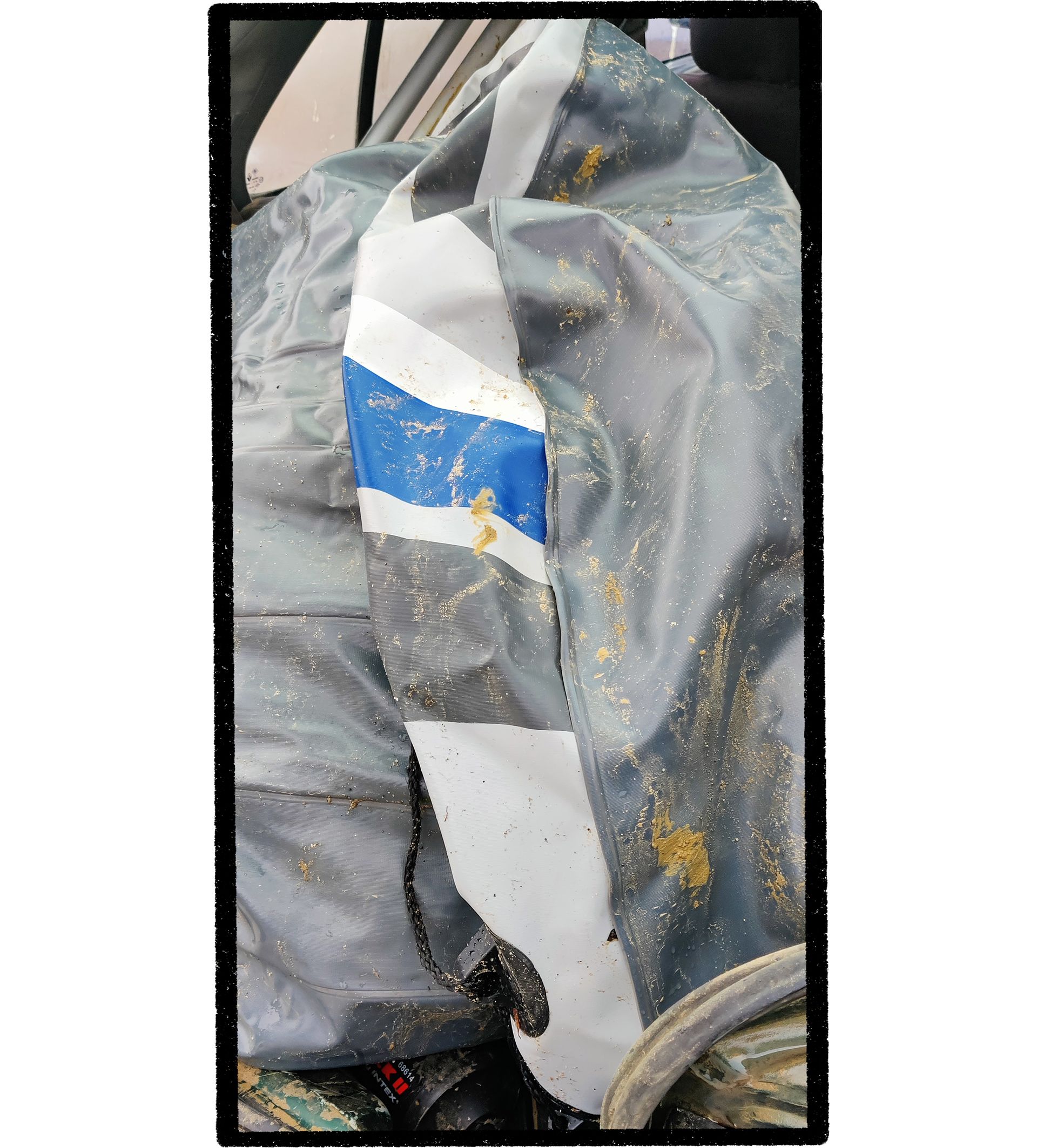 O barco insuflável resgatado no rio. Vai a concertar, com pedaços de borracha e supercola 3 e depois será vendido a quem quiser atravessar o rio. DR