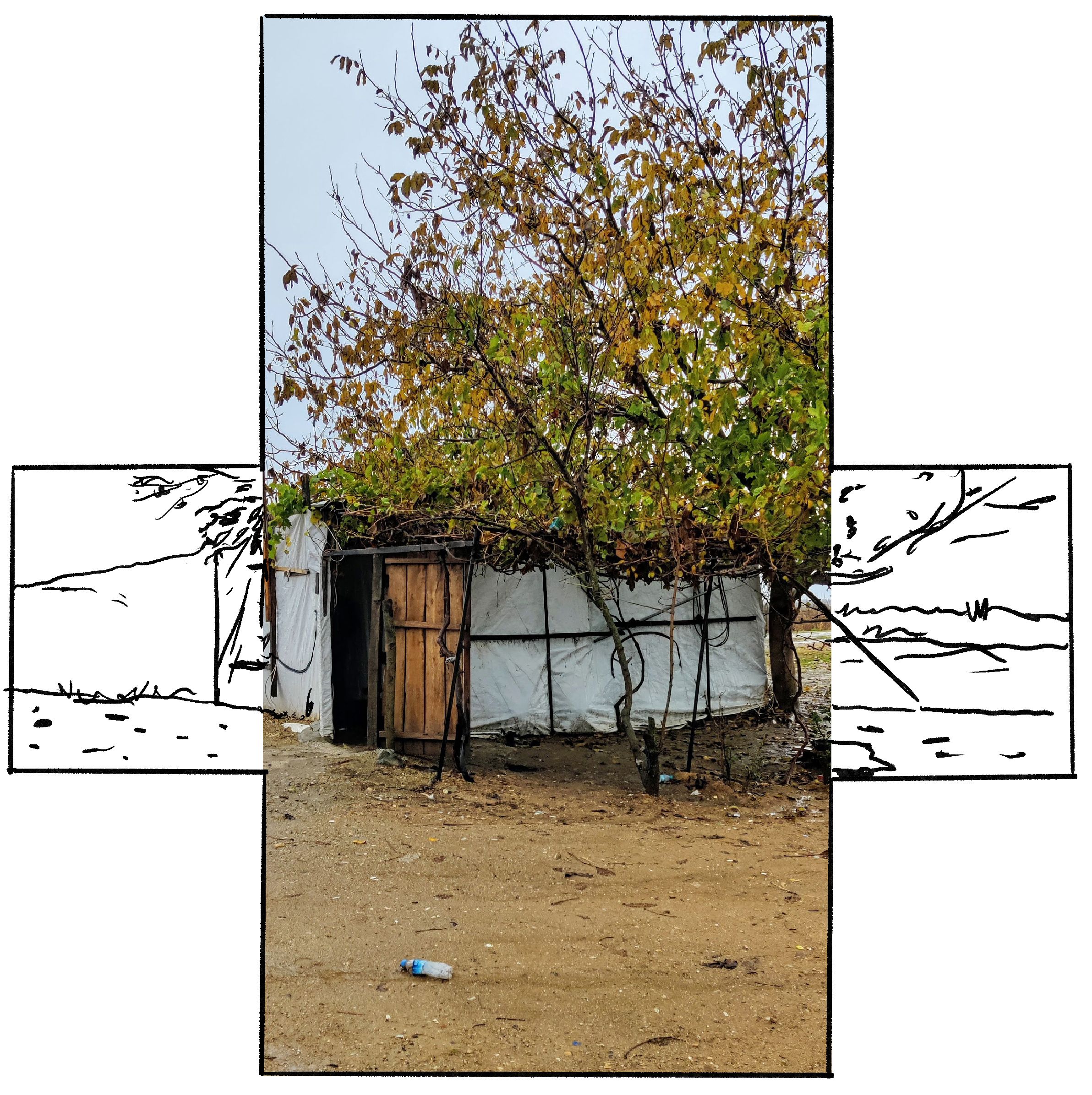 Mesmo no limite da zona militarizada está uma casa minúscula, as paredes são paus de madeira e plásticos agrafados uns aos outros. “Anda, anda.” “Vives aqui? Esta casa está abandonada?” Ali nada diz. Corre para fugir da chuva e por fim entramos na “casa”. Estão lá 15 rapazes, a dormir em colchões sujos ou sobre cobertores, encaixados uns nos outros. No centro há uma espécie de aquecedor, que se parece muito com um fogão antigo, funciona a lenha e os rapazes estão dispostos à roda do calor. Ali ficou de ir à vila buscar pão e queijo, mas não levou dinheiro suficiente e veio ver se lhe dão mais uns trocos. Há garrafas de água por todo o lado, muitas caixas de analgésicos, gaze, Betadine. Ninguém quer acordar. Ali abana um deles, pede 100 liras, cerca de 10 euros, mas contenta-se com 30 de um e 50 de outro.