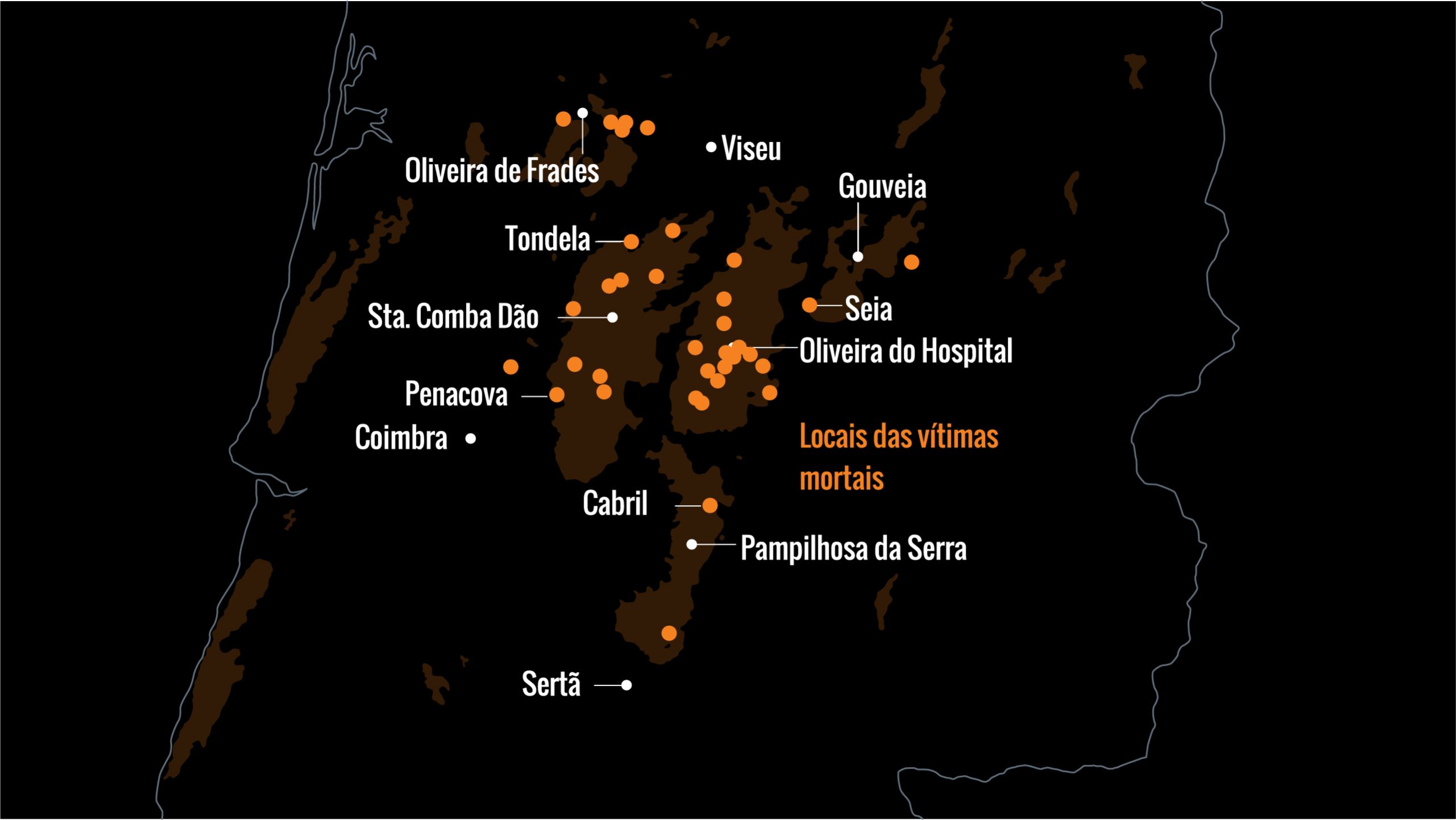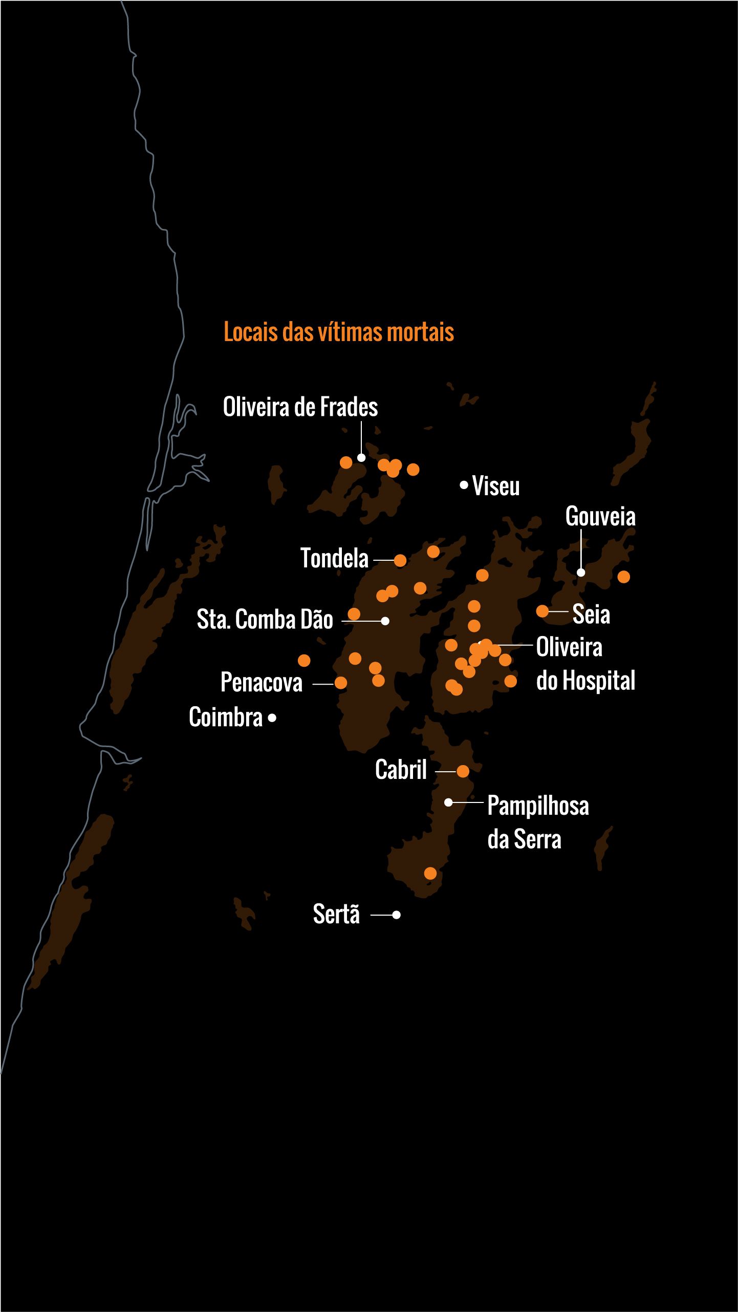 Mais de 900 fogos mataram cinquenta pessoas nos distritos de Coimbra, Viseu, Guarda e Castelo Branco, mais homens que mulheres, mais idosos que novos, a esmagadora maioria residente. O fogo – um fogo feito foguetes de lágrimas, bolas de fogo, furacões de lume - apanhou quase todos ainda na luta ou de surpresa a dormir, tal foi a velocidade com que comeu 241 mil hectares de floresta, mato, casas e empresas.
