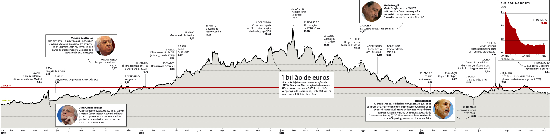 Em virtude da decisão da Fed, Draghi acelera o passo e, em julho, inova anunciando uma orientação futura (forward guidance), no caso, um período prolongado de taxas de juro muito baixas. A 4 de novembro, decide cortar os juros para 0,25%, um novo mínimo histórico. Os juros da dívida descem para menos de 6% no mercado secundário; contudo ainda não regressaram aos níveis de 7 de maio. Depois da ajuda de 2012, Draghi pode ter uma importante palavra a dizer sobre o regresso aos mercados da dívida no pós-troika. Ou melhor, a palavra já a disse sobre o OMT. Agora só resta usá-lo.