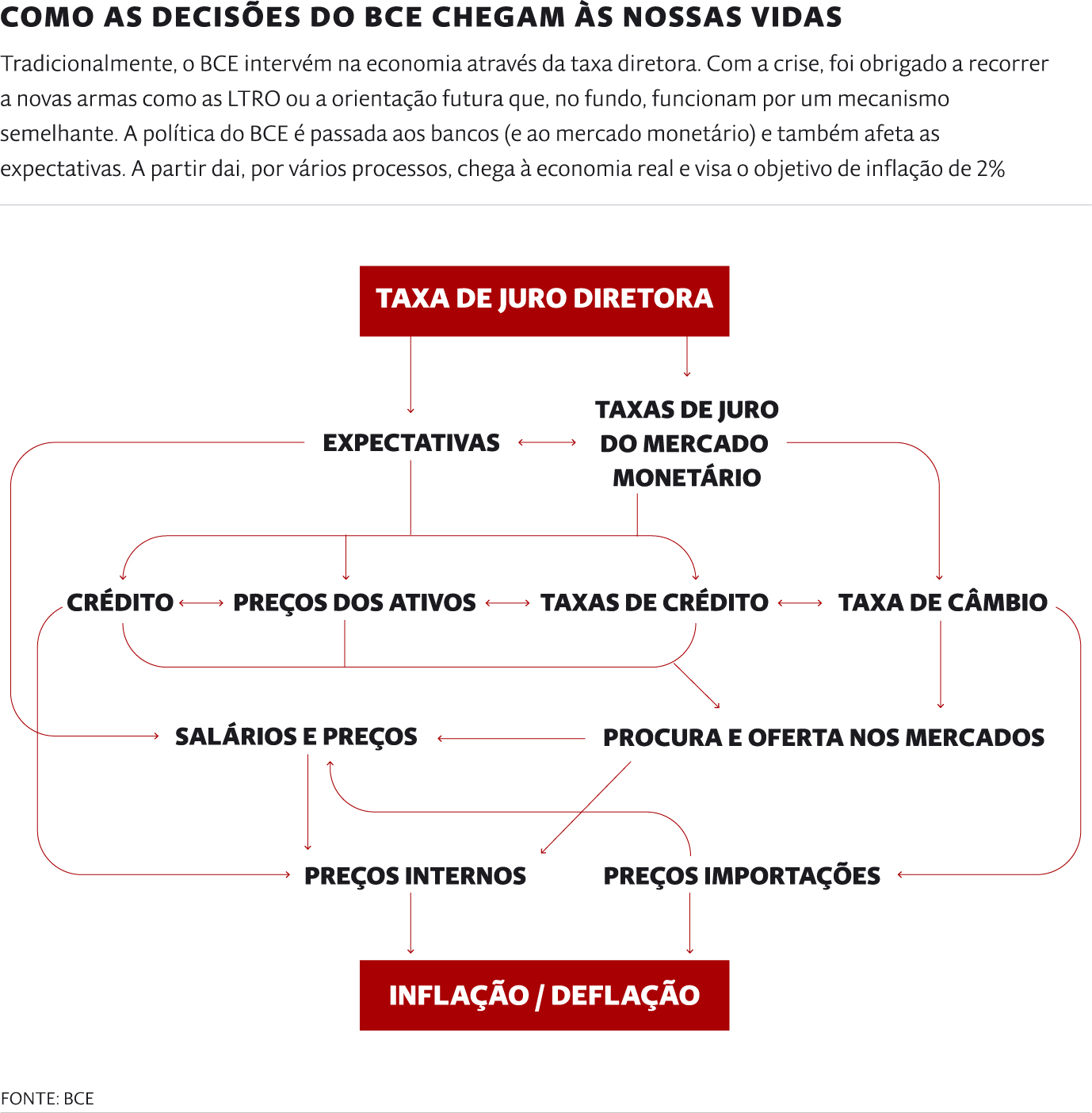 Em tempo de sucessivas vagas de austeridade, as poucas boas notícias que as famílias portuguesas vão recebendo vêm de Frankfurt. Sempre que o Banco Central Europeu (BCE) baixa a taxa diretora — e já o fez por diversas vezes desde o pico da crise financeira em 2008 — os créditos (de taxa variável) a pagar aos bancos tornam- se mais baratos. Os empréstimos são normalmente indexados à taxa Euribor e esta acompanha o 'nível das águas' definido pela política monetária. Este é, aliás, um dos canais privilegiados de transmissão das decisões do banco central à economia real (ver infografia).
