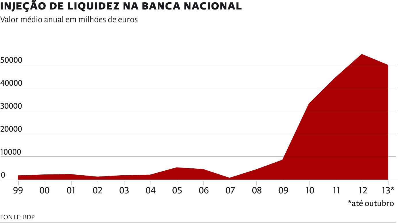 Entre 2011 e 2013, os bancos nacionais viveram com um volume médio de empréstimos do Banco Central Europeu (BCE) de €49,7mil milhões. Foi um importante contributo para o financiamento externo português, dirigido aos bancos, que substituiu as fontes tradicionais. A cedência de liquidez do banco central teve um pico no verão de 2012, quando chegou aos €60 milmilhões, e está atualmente (em outubro) em €50,5 mil milhões. É uma espécie de complemento do resgate que, com esta parcela, ascenderia a €128 mil milhões. Ou seja, este financiamento aos bancos representou cerca de 40% dos fundos totais cedidos a Portugal pelas instituições internacionais.