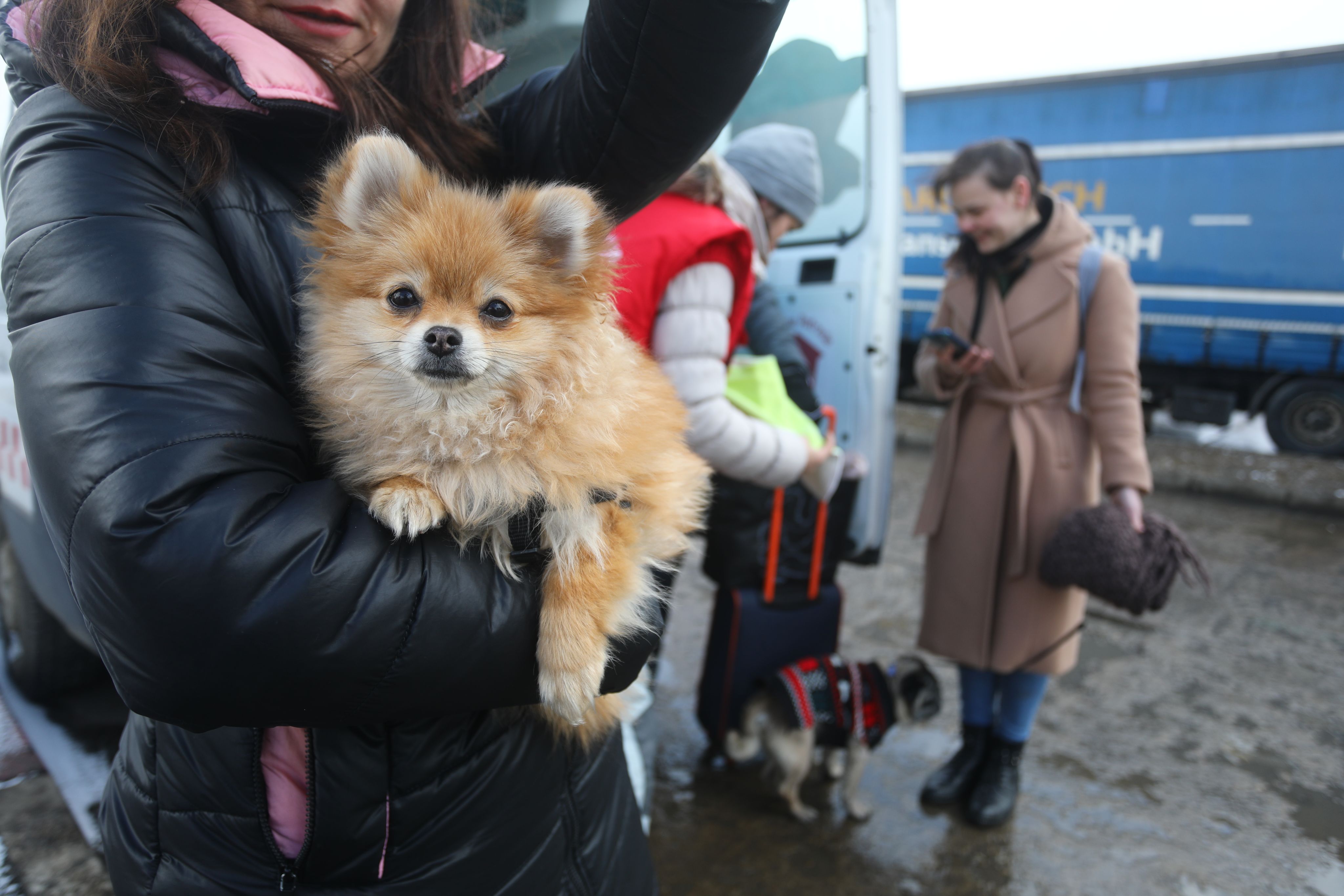 Entretanto, no piso térreo do abrigo acumulam-se uma série de pessoas: as que chegam para procurar abrigo e as que saem para continuar a viagem de fuga. Ouvem-se os cães ladrar — quanto mais pequenos mais barulhentos — há muitos animais de estimação nos abrigos. Muitos usam fraldas como bebés não apenas para evitar acidentes nas malas e nas camas das pessoas, mas também porque muitos não se conseguem controlar após vários dias de viagem e à violência a que foram também eles expostos.