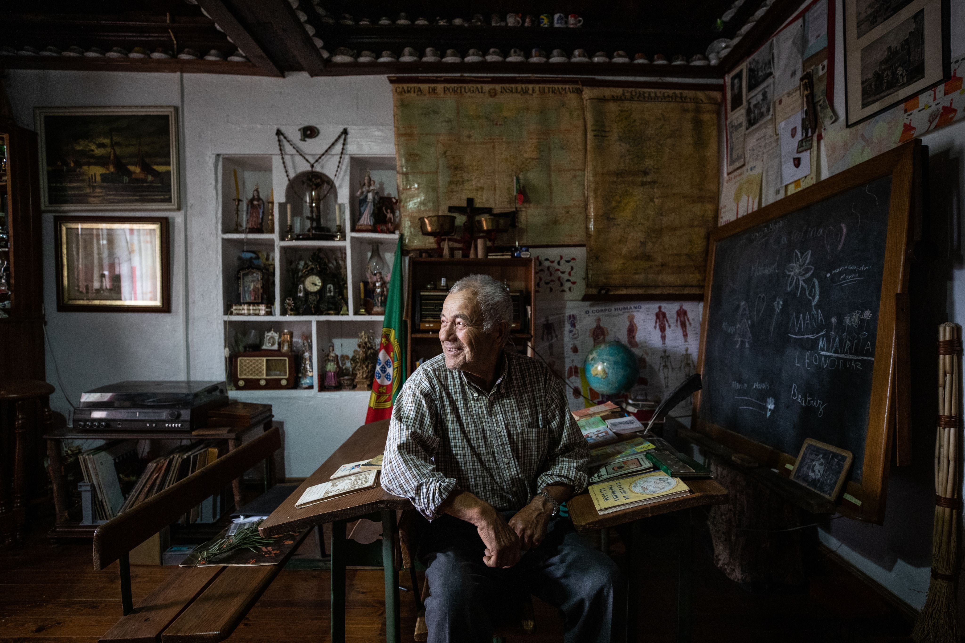 Elísio Morais guarda em casa a antiga escola primária da aldeia. As carteiras, a caneta permanente, os livros do tempo da mocidade portuguesa, combinados com a bandeira, o quadro a giz e os mapas do Portugal Ultramarino.