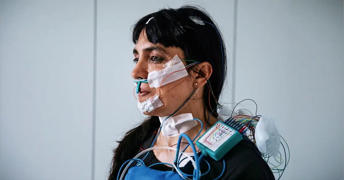 Primeiro as pernas, depois os braços, as mãos, as costas e, finalmente, a cabeça, agarra-se em meadas de cabelo, abrem-se clareiras, pequenos círculos brancos do tamanho de um elétrodo. Despontam fios, crescem, entrelaçam-se, seguem em direções diferentes, uns mais retos, outros mais ao largo, encontrando-se mais à frente num dispositivo em forma de caixa preso ao peito, onde são ligados. “O que se pretende com o registo poligráfico é saber o que está a acontecer entre o cérebro e o corpo durante o sono”, explica a neurologista.