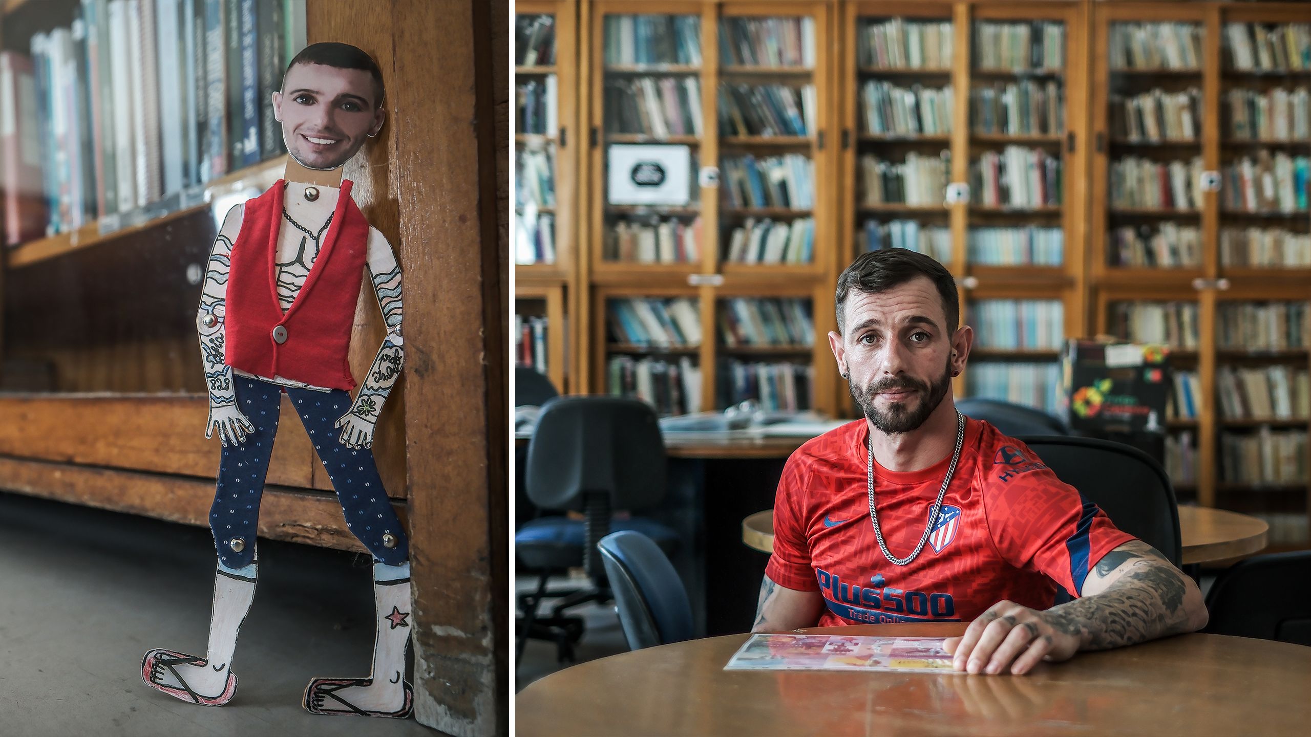 Quando conversámos com Benjamin, estava na cadeia há dois anos e meio — exatamente a idade do liberto Gente Séria. O boneco que a professora Isabel sugeriu que criasse recebeu o nome da alcunha com que Benjamin é conhecido na claque dos Super Dragões, do Futebol Clube do Porto, o seu “clube de coração”, como gosta de dizer. E nem seria preciso dizê-lo. A camisola de riscas azuis e brancas, justa para o diâmetro da barriga, anunciava a paixão antes mesmo de abrir a boca.