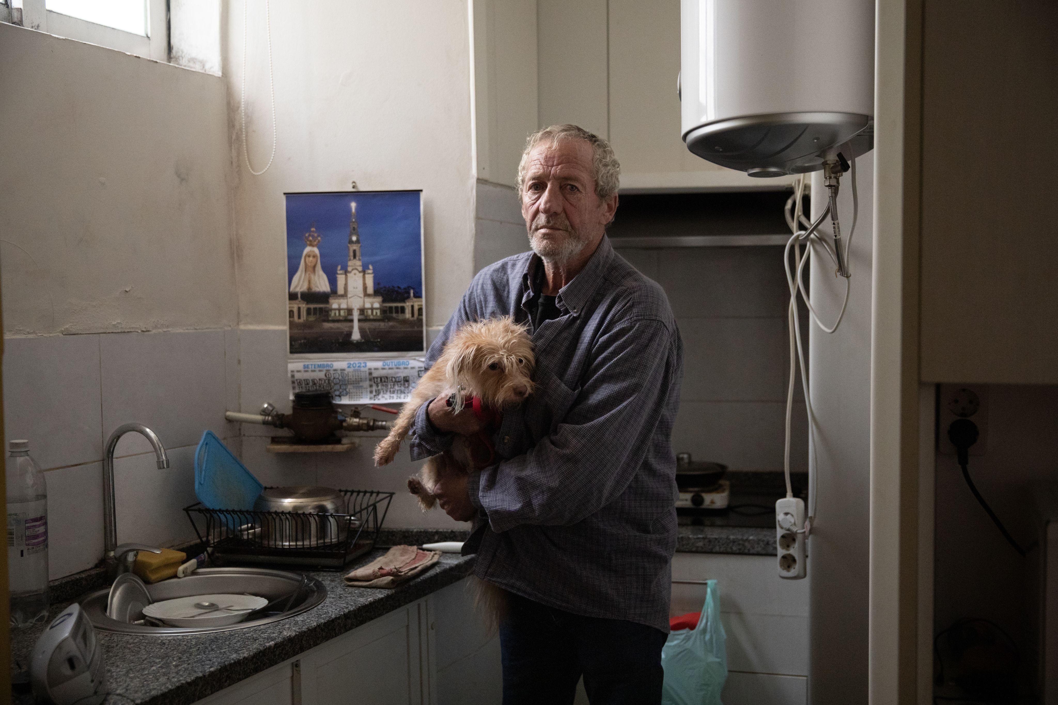 A casa é para mim o refúgio. Vivo com alegria, mas às vezes com tristeza. Ainda choro. Escondo-me às vezes um pouco, não sei se é vergonha, mas tenho de desabafar comigo próprio. É que não é fácil estar sozinho. A solidão é difícil de combater. Já tive maus momentos aqui antes de ter o animal. Deus queira que Deus me ajude mais. A minha bichinha é a minha companhia. Tem dez meses, vai crescer comigo. Agora vem aí o inverno, a casa é um bocado fria, mas não é de certeza pior que os papelões. Aqui basta por um edredom mais quente. Não tem nada a ver.
