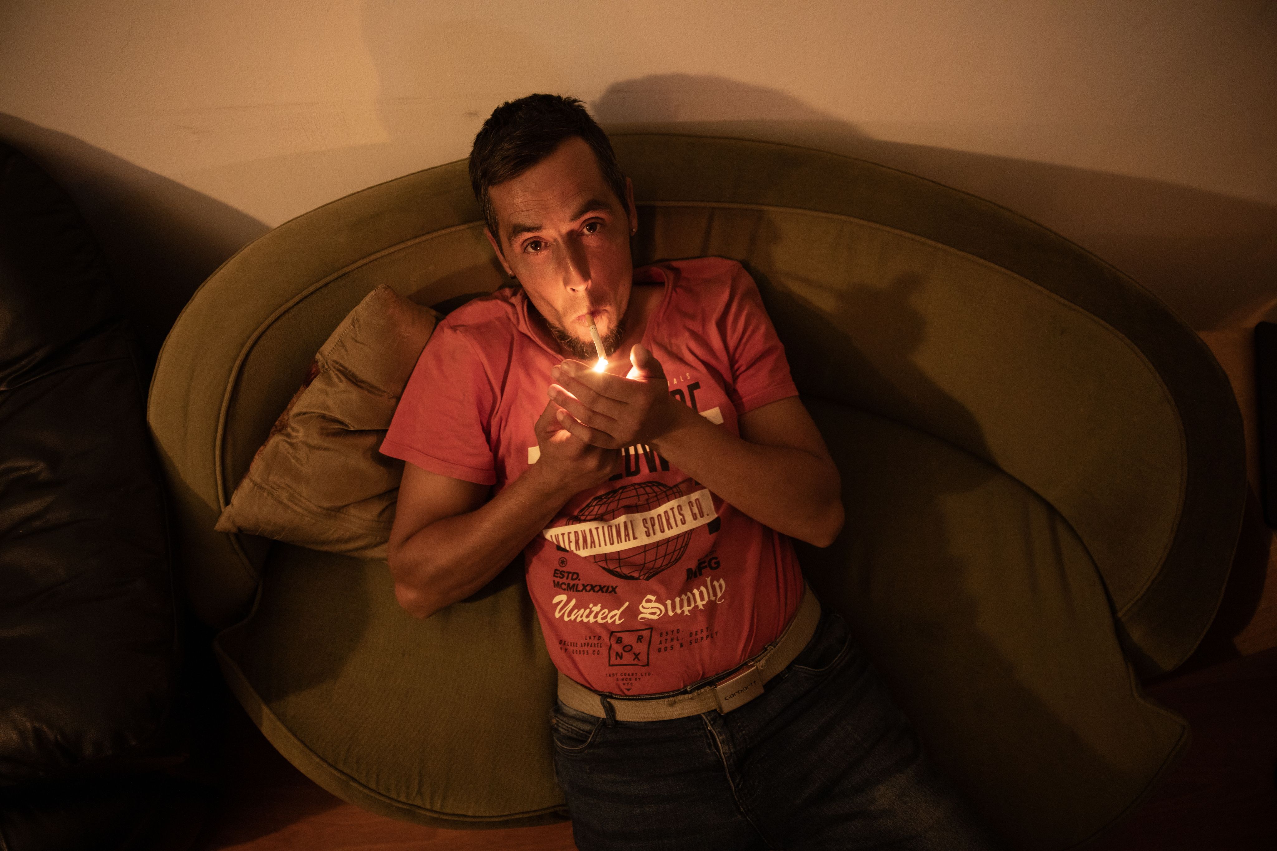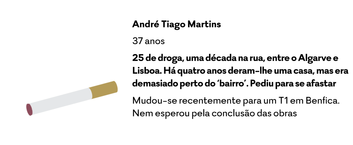 Eu sou bué fraco do psicológico. É só cinco euros a dose, é só uma… Venho do trabalho, o meu colega deixa-me em Campolide e vou direto ao bairro. Quando vejo estou aqui a consumir. Nem sei como cheguei cá. Parece que sou um robô. Não quero, não quero, e depois dou a primeira passa e começo a chorar, não é isto que quero para a minha vida, fico bué revoltado, de um problema arranjo sete ou oito. Quem anda à minha volta leva com os baralhos. Fumo e choro de arrelia, nem sequer fico alegre.