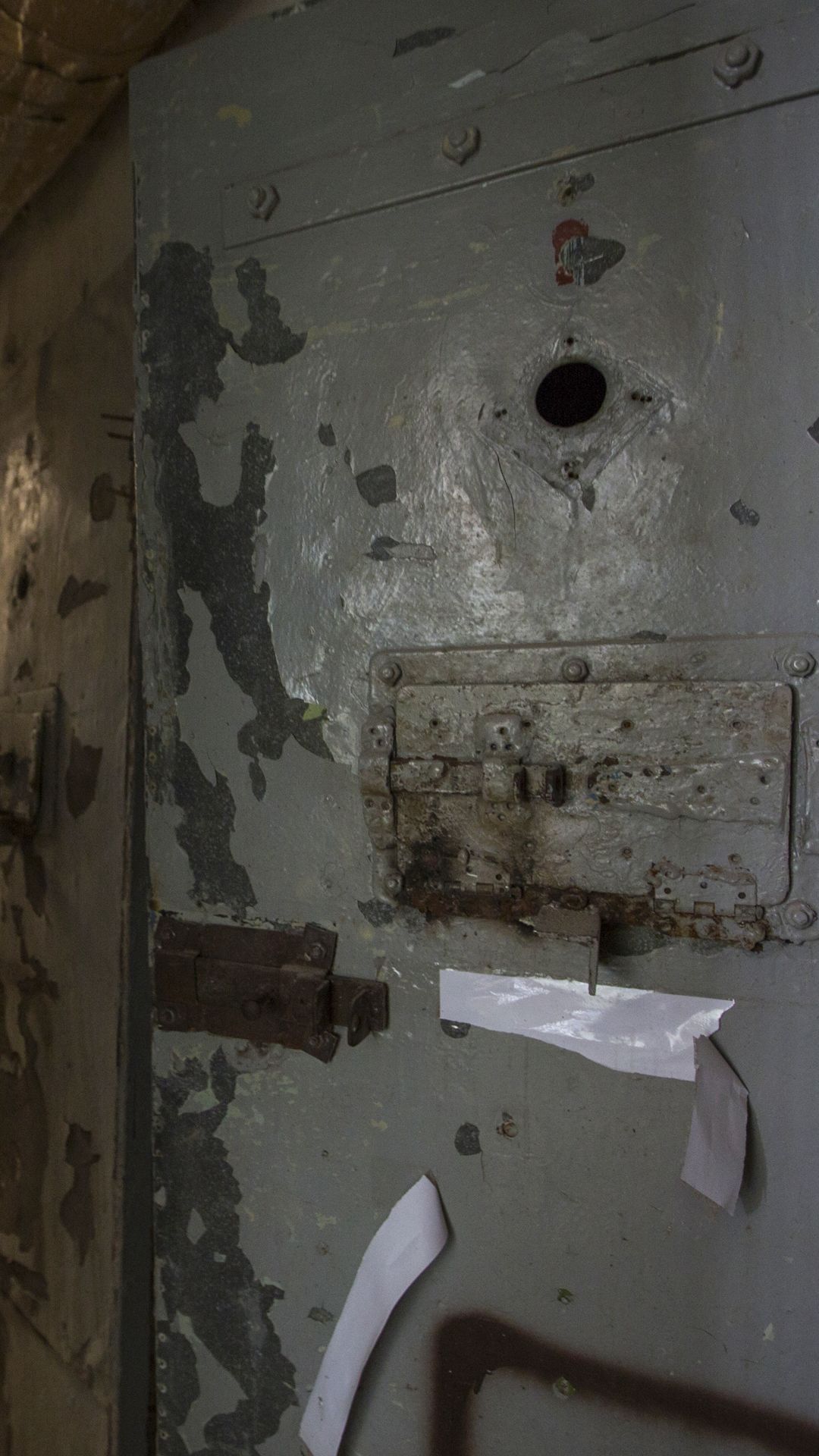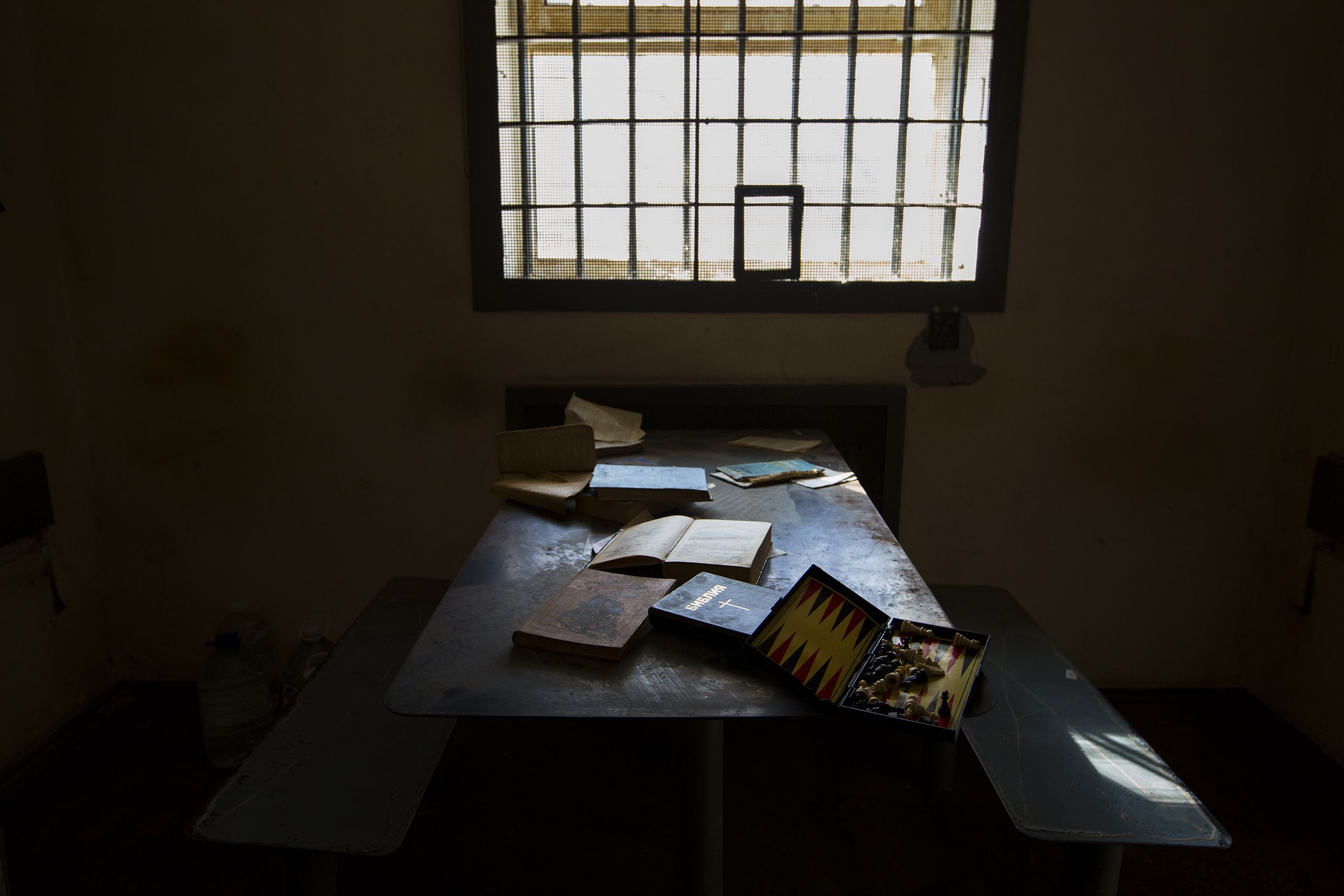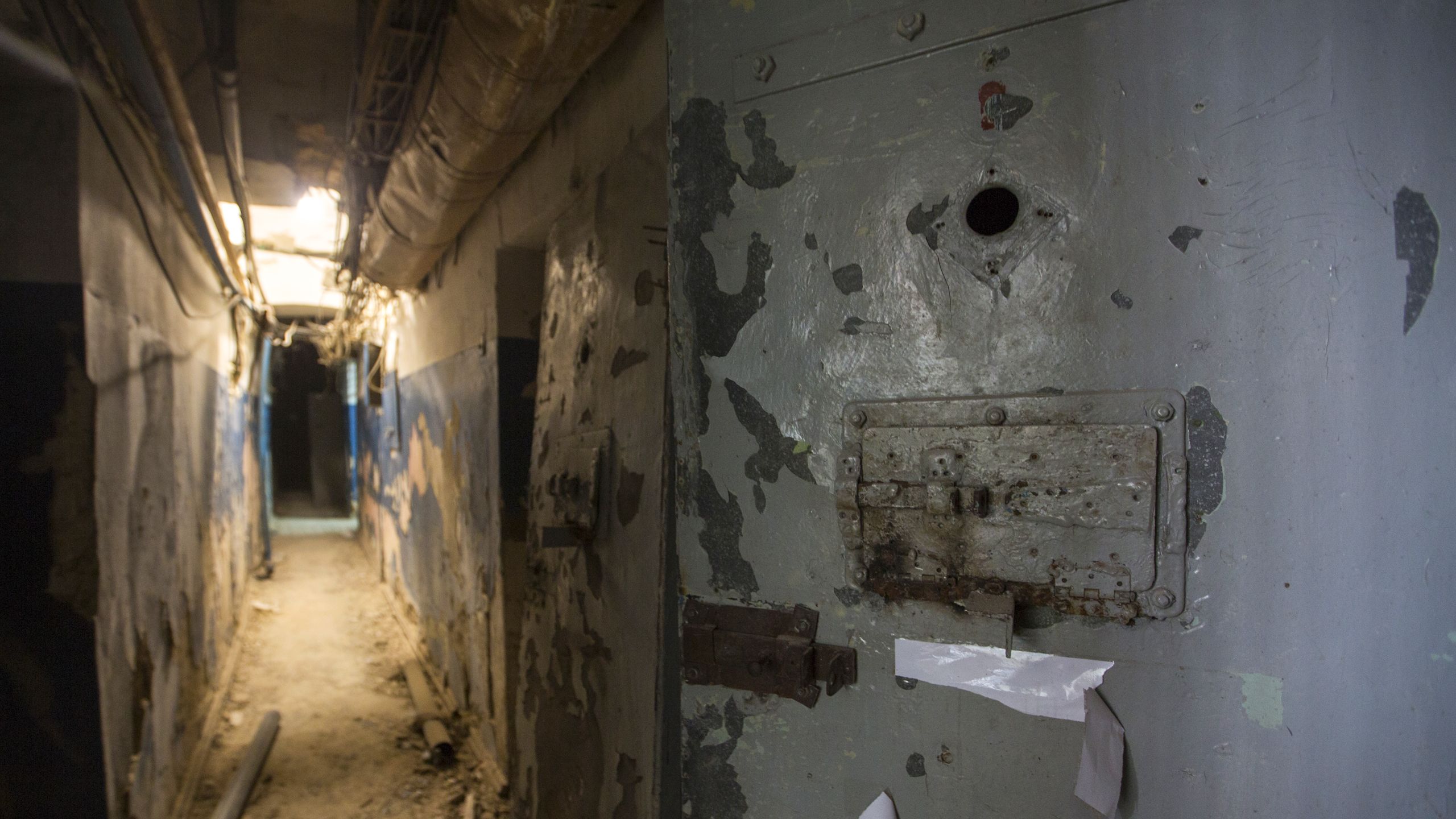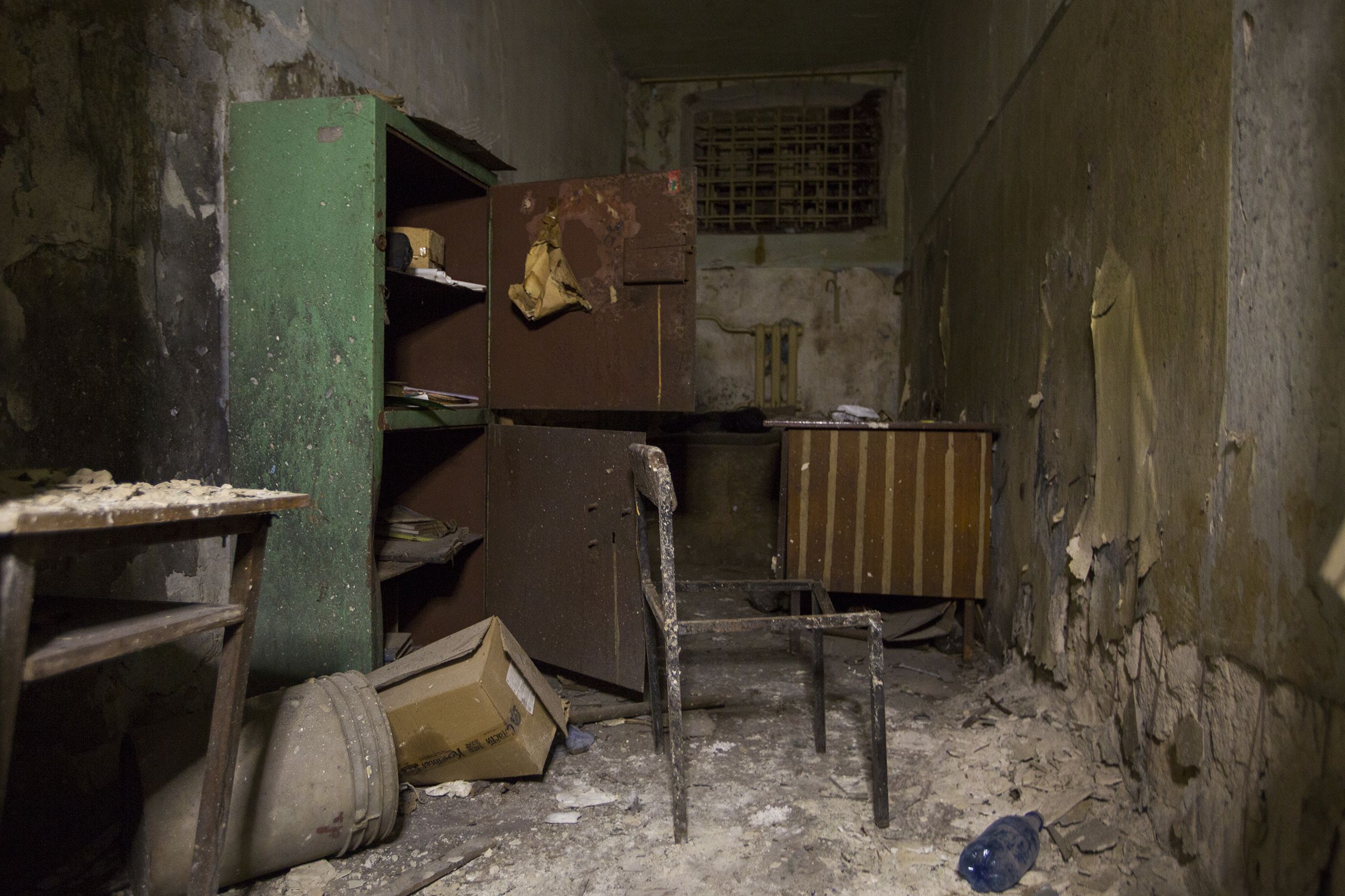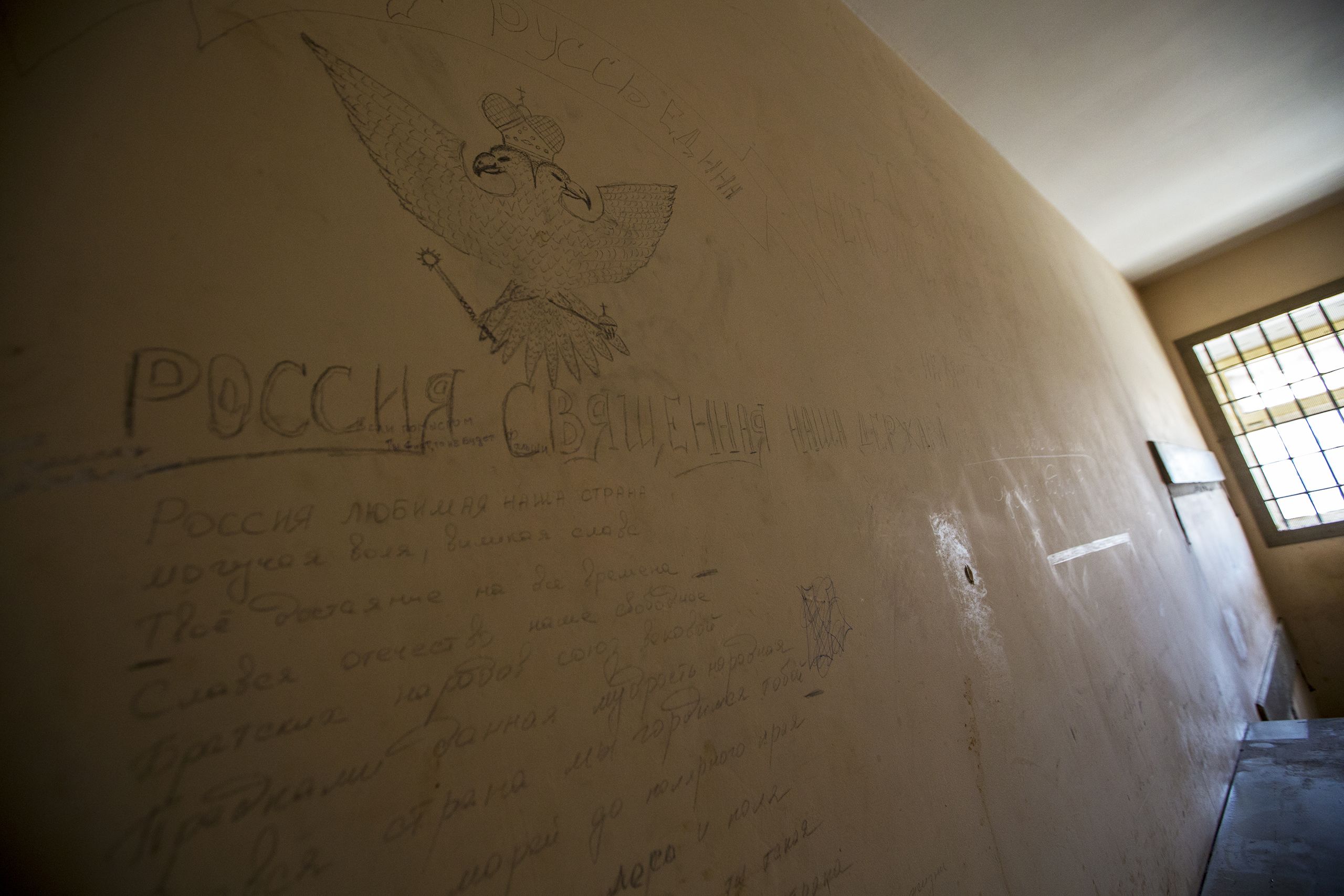 O hino da Rússia está escrito em quase todas as paredes. “Morte aos nazis”, “Não mintas”, “A Rússia vai vencer”, “Tudo será Rússia”, “A Ucrânia é Rússia”. Frases como estas enchem o espaço que resta. “Nesta sala havia sessões de choques e afogamento simulado”, conta Kovany. É uma sala grande, com um grande bidão n de água no parapeito. “Por vezes havia execuções fictícias. A pessoa é levada a crer que vai morrer, e depois volta para a cela. Era neste corredor que se faziam torturas demonstrativas, fora de portas, para todos verem.”