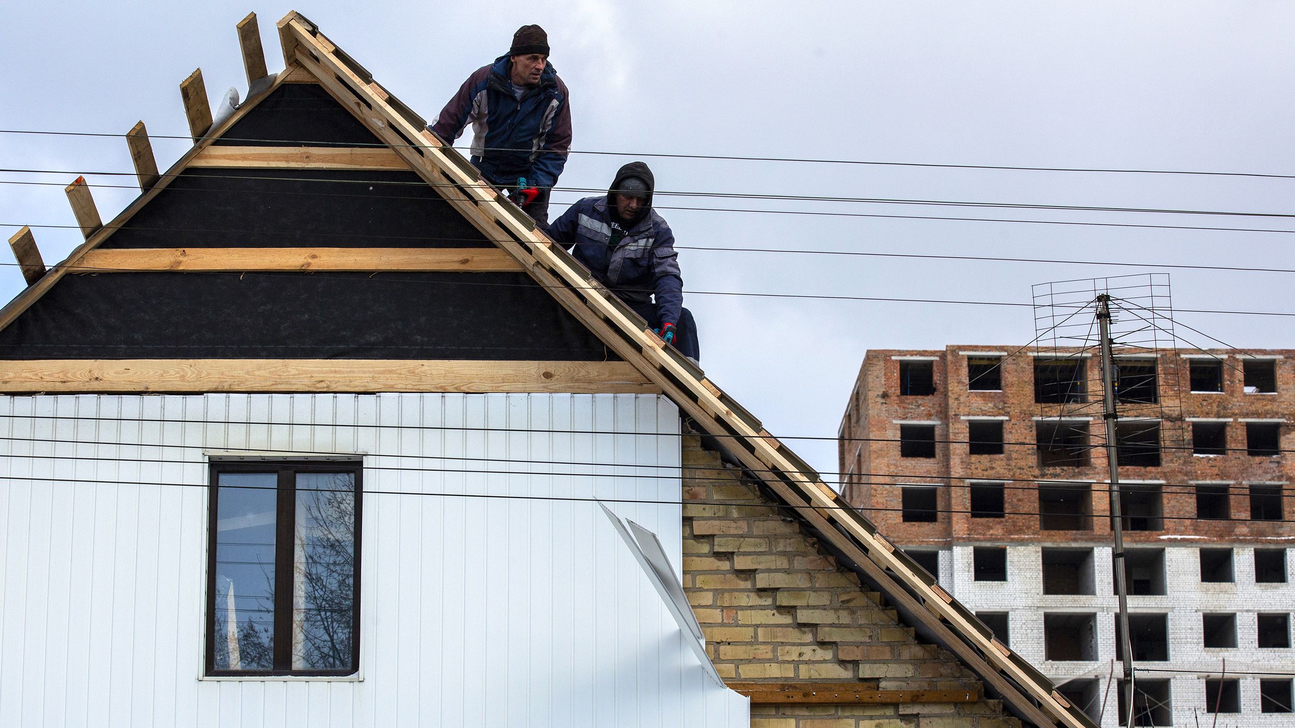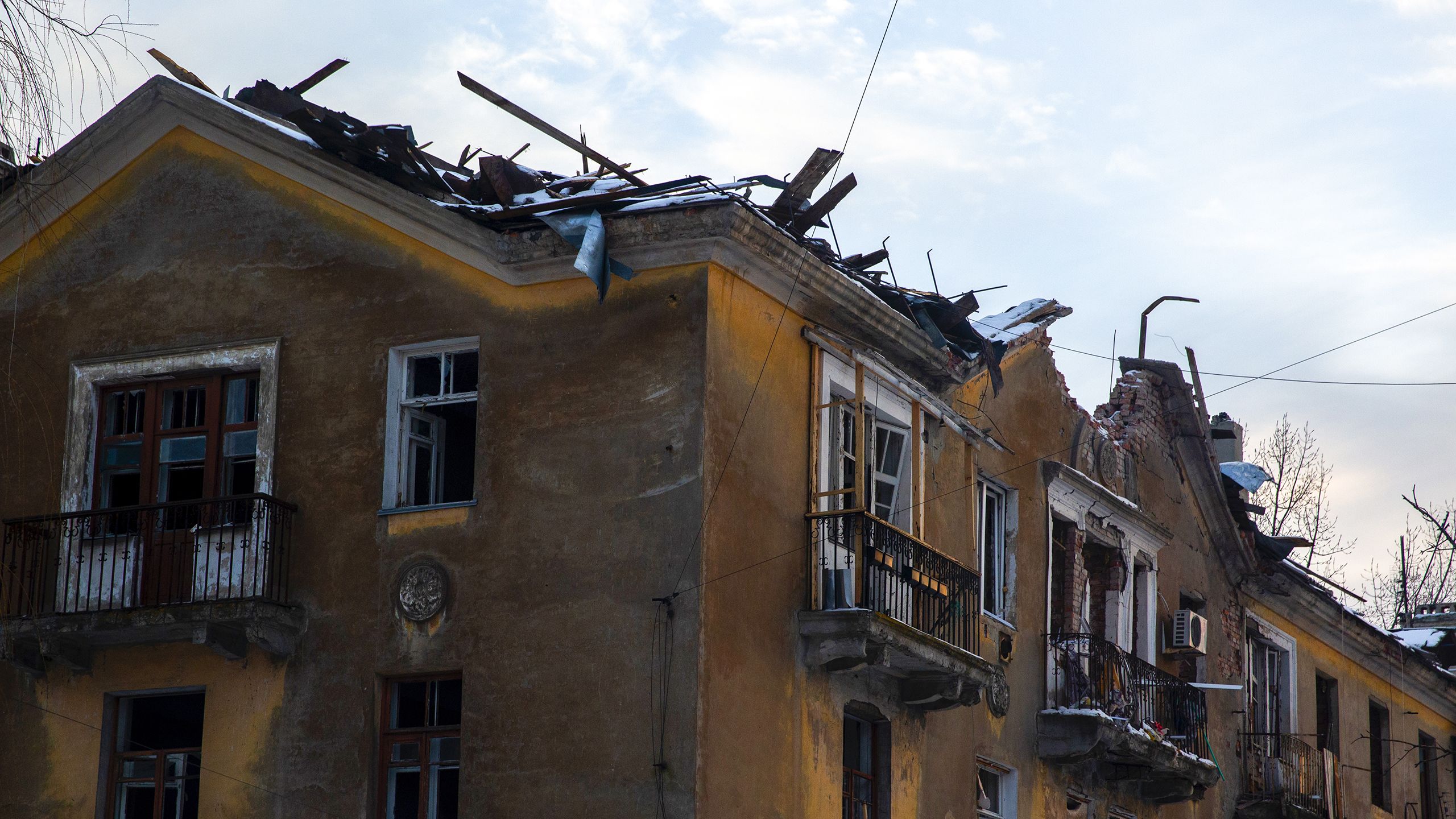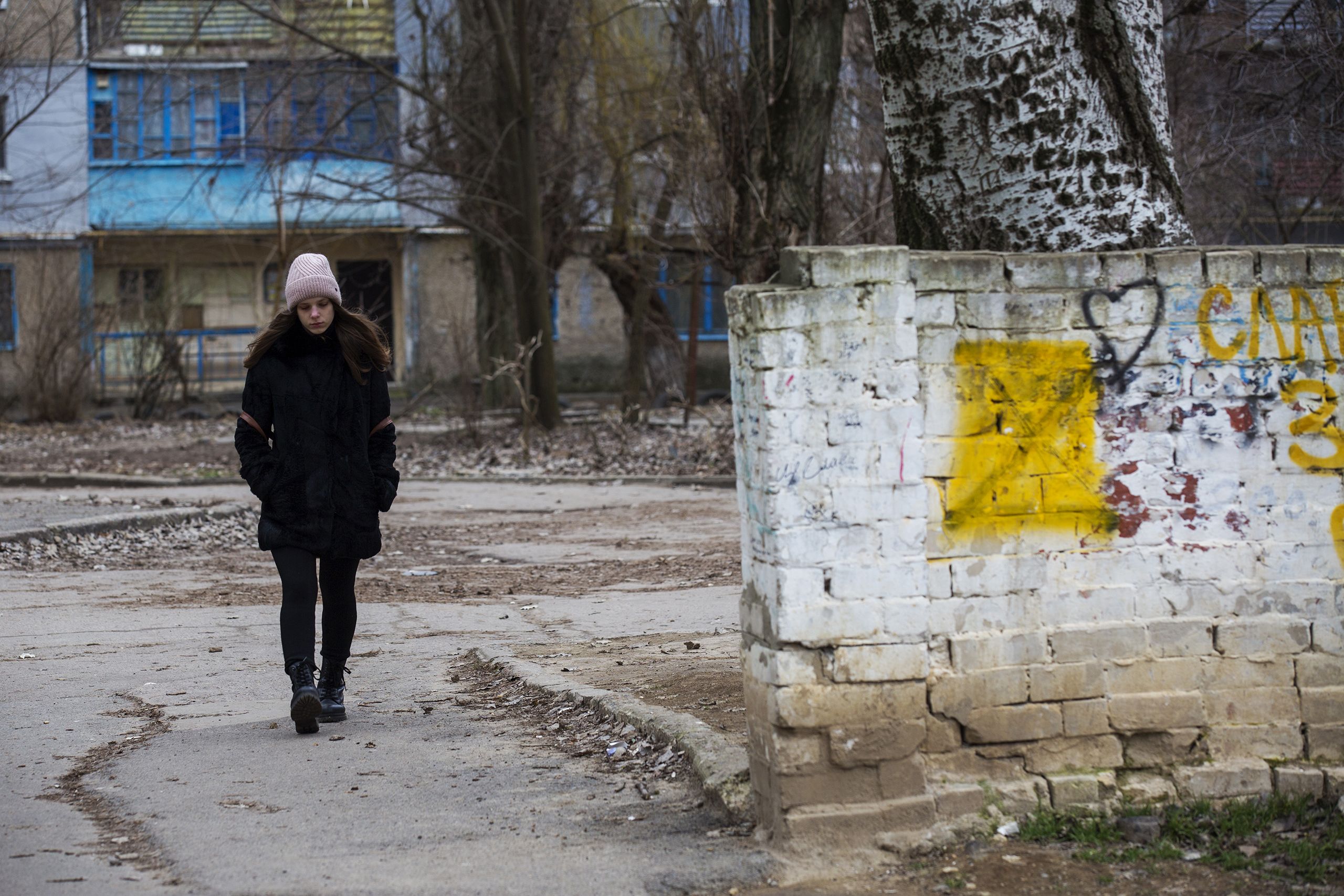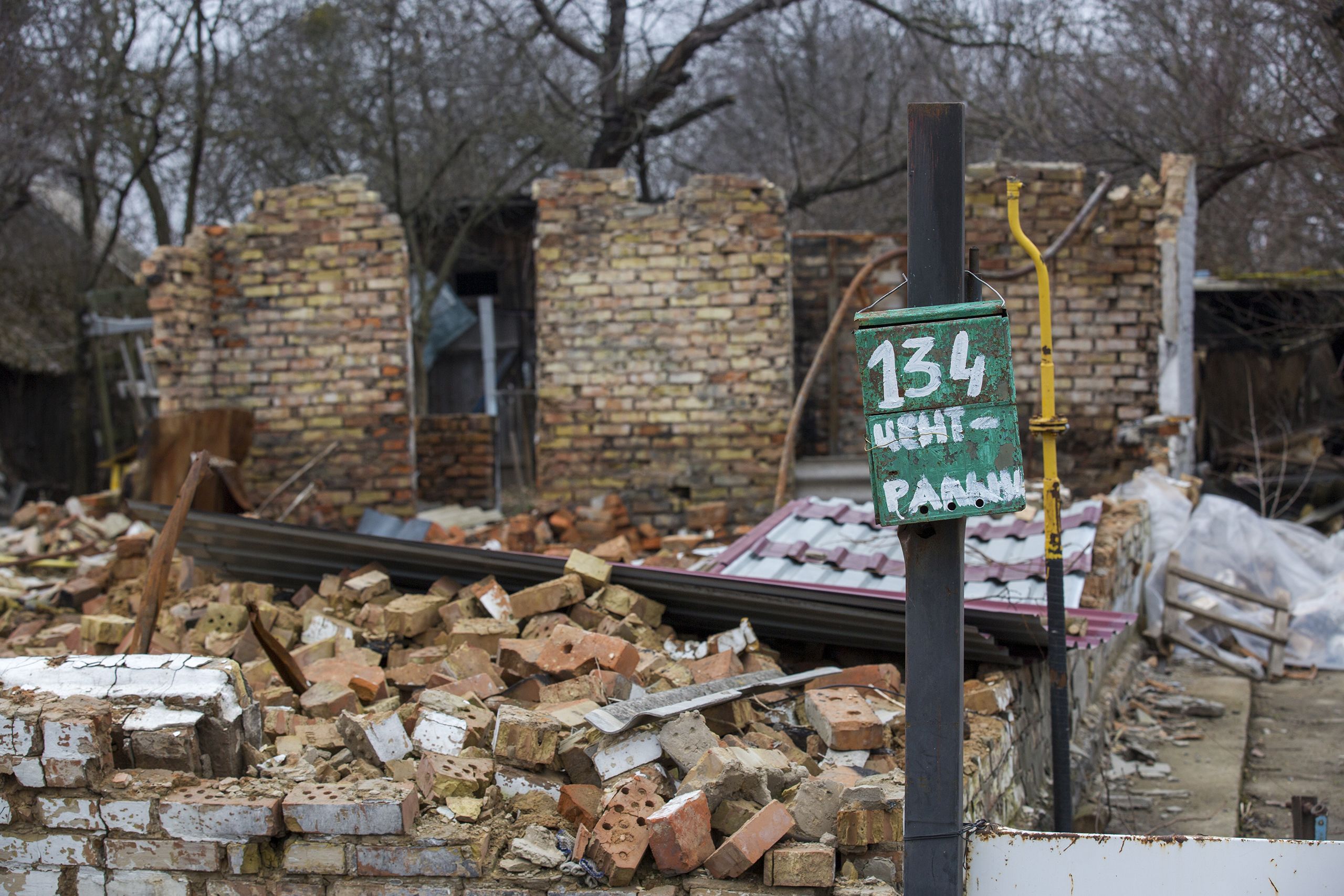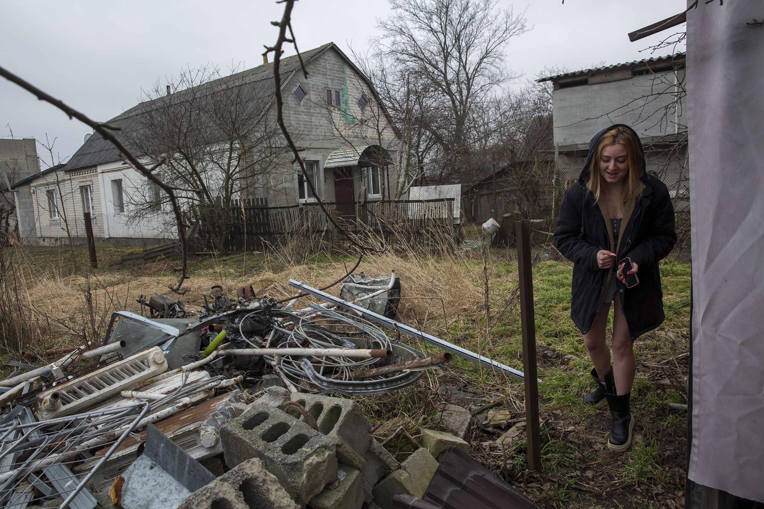 Continuamos pela rua. Uma rapariga de casaco de inverno e pernas descobertas abre um portão novo. Muitos têm buracos de balas, amolgadelas, contorcem-se nas dobradiças, ou estão encostados aos muros das casas. Estava à espera do tio, que vem cheio de sacos de comida. A casa tem janelas novas, o resto vai levar meses a reparar. O telhado foi destruído por um morteiro que aterrou num quarto vazio. A protegê-los da chuva têm placas de zinco, que o Governo distribuiu. “Foi a única coisa que fizeram, e mesmo assim tivemos quase de suplicar.” Valeria Davydenko tem 24 anos e um mar de entulho a tapar-lhe o horizonte dos sonhos. Desilude-a a falta de investimento na reconstrução. Só pensa em mudar-se para o Canadá.