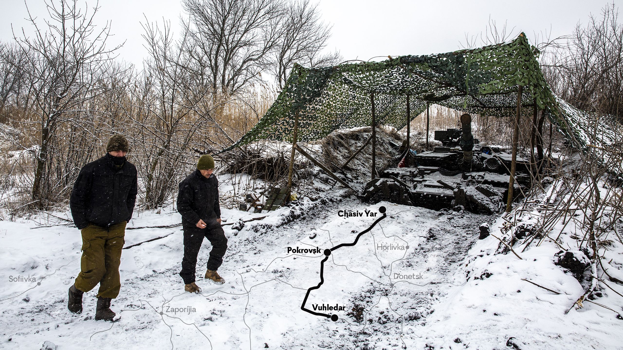 A frente leste forma um quarto crescente por cima do território ucraniano. Começa à volta de Drorichna, 100 quilómetros a leste de Kharkiv e continua, passando por Bakhmut e Vulhedar, onde mais homens de ambos os exércitos têm morrido, até atingir uma reta até à foz do Dniepre, a sul, perto de Kherson. A Crimeia está ali por baixo e é por isso que a conquista de Kherson, única capital de distrito que os russos capturaram, foi tão rápida. Saímos de Pokrovsk pelas 6h da manhã. Temos de estar numa vila perto de Vulhedar às 8h30. O plano é esperar num cruzamento de quatro ruas, cujas coordenadas o assessor de imprensa da brigada envia ao nosso intérprete. Nada existe além de um manto de neve à nossa frente.