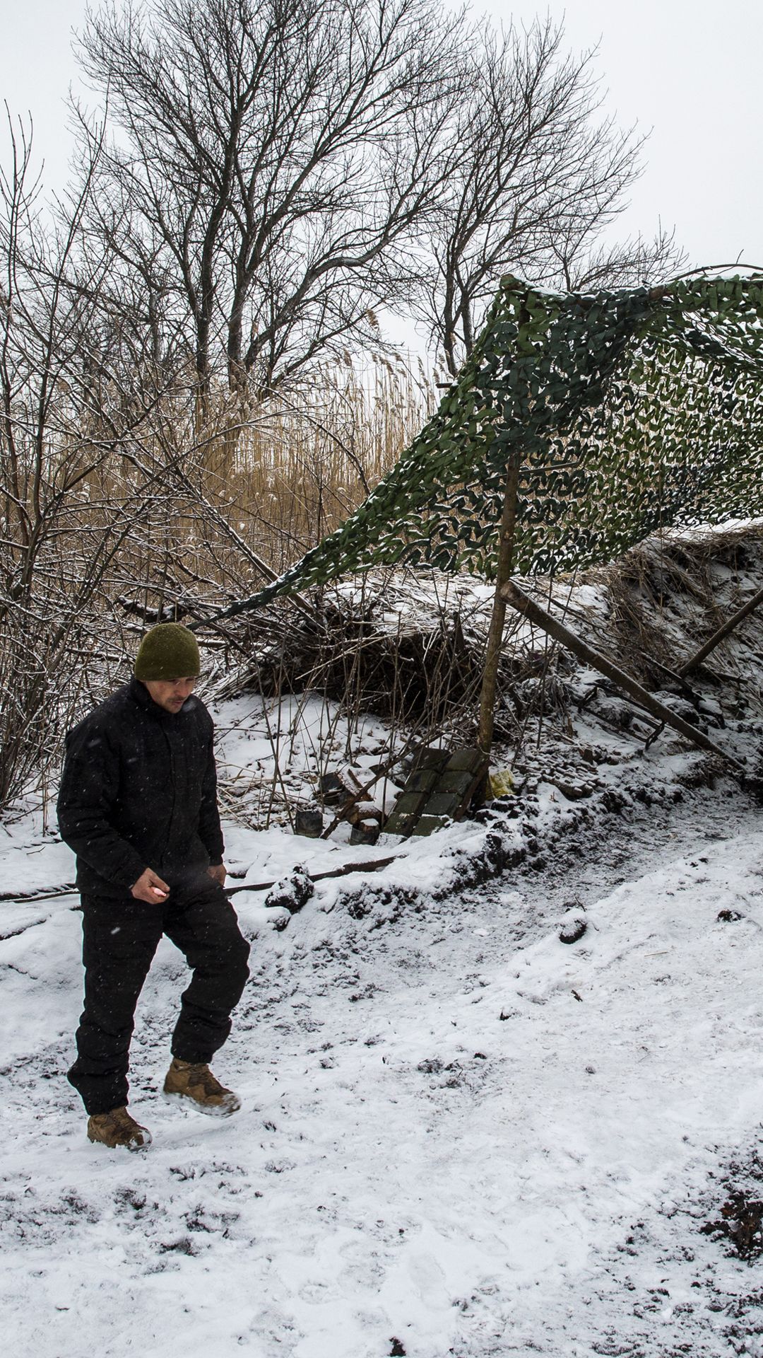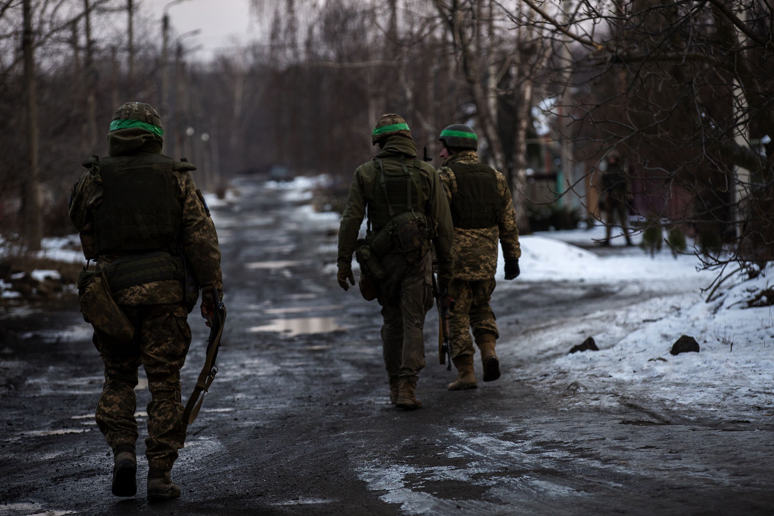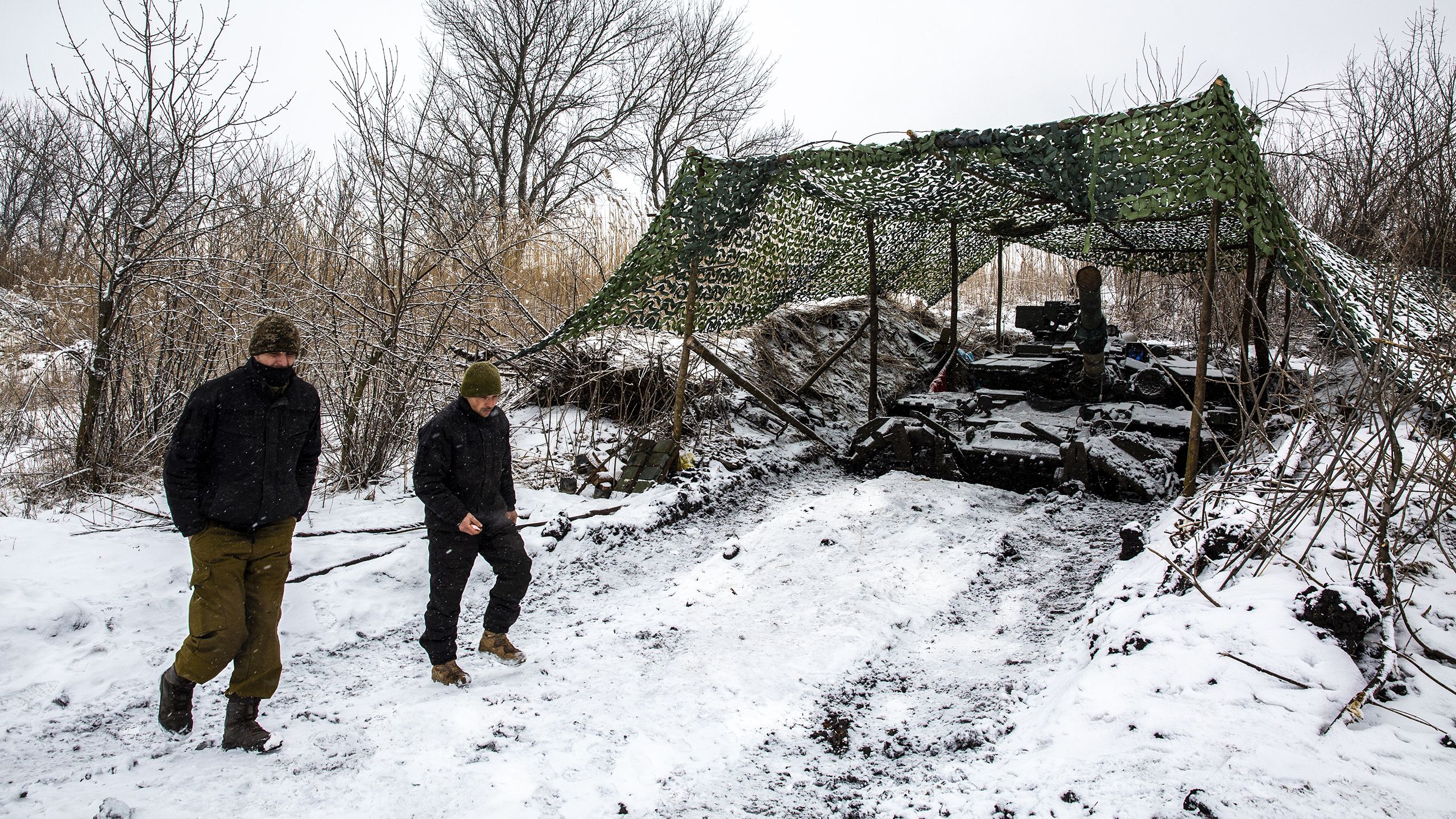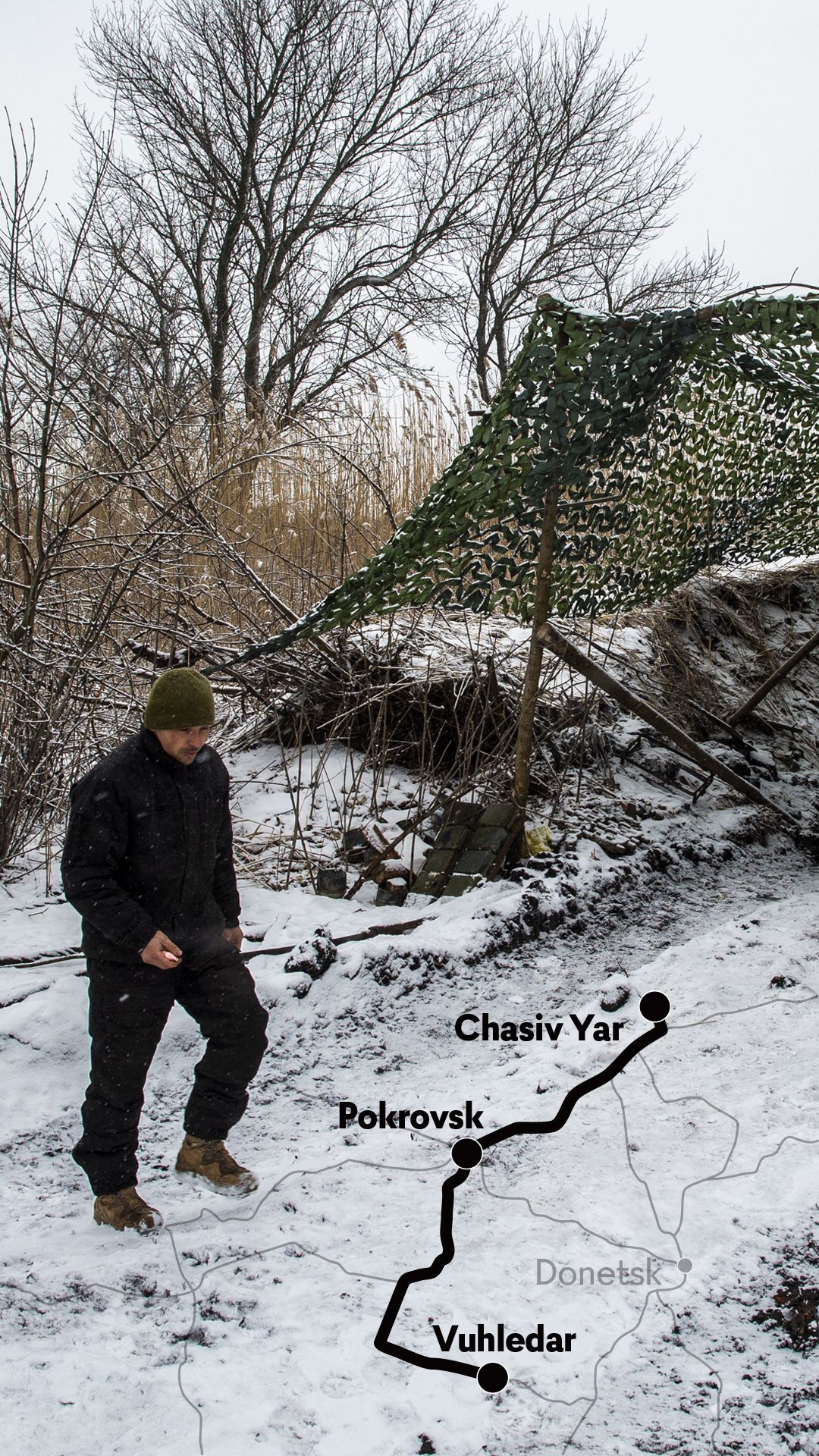 As tropas russas continuam a avançar, ainda que as suas conquistas se meçam com fósforos. À entrada do distrito há um cartaz grande: “Donetsk, distrito inconquistado”. As paragens de serviço destruídas, desativadas, só servem para abrigar militares da neve densa e esta fixa-se nas barbas e nas sobrancelhas dos que nos pedem documentos. “Vão e venham a voar”, aconselham.