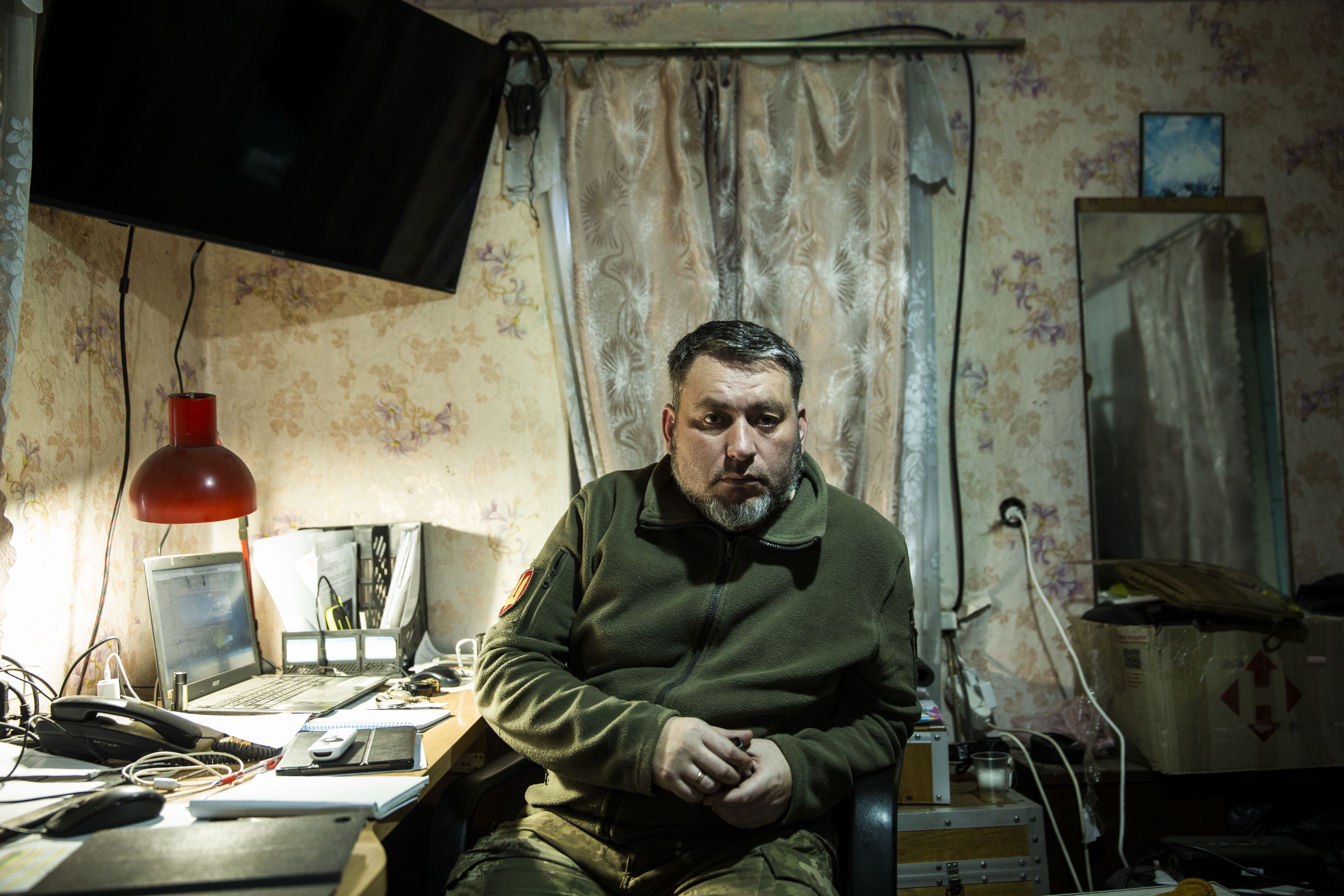 Na sala de estar um ecrã ocupa metade da parede. O comandante da companhia, “Tiger”, passa quase o dia todo a olhar para ele. Não se pode fotografar. Vê-se a linha da frente, com um zoom de 20 vezes. A imagem é surpreendentemente nítida, tendo em conta o nível da aproximação, e chega quase em tempo real. “Estar na frente pode ser confuso, miserável. Os nossos rapazes estão horas sem saber o que estão a ouvir, de onde vêm os disparos, se são da nossa artilharia, nunca sabemos onde nos esconder, é terrível. O nosso trabalho é dar-lhes mais informação.” Os russos estão a menos de sete quilómetros. As posições de tiro estão a dois quilómetros das forças de Moscovo. “Dou as coordenadas, olho e vejo onde explodiu o nosso projétil. Daqui conseguimos avaliar o que acontece ao alvo. Se não for destruído à primeira, as nossas posições de tiro continuam a atingi-lo até estar arrasado.”