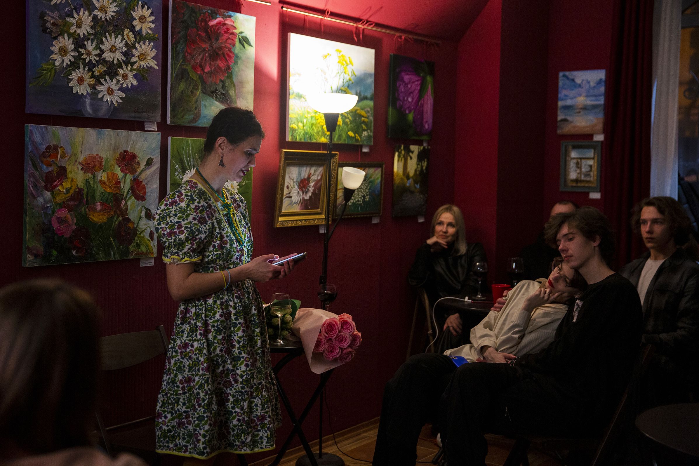 Dmitry anda à procura de mais cadeiras, todos querem ouvir a poesia da cozinheira da linha da frente. Marina tem um vestido às flores, mangas de balão, duas tranças negras que cruza como bandolete por cima da cabeça, batom cor de vinho. Parece tudo menos uma mulher que, diz ela, quase obrigou os soldados a deixarem-na ajudar no esforço de guerra. A sua poesia, agora, é sobre o que viveu na frente, perto de Kharkiv.