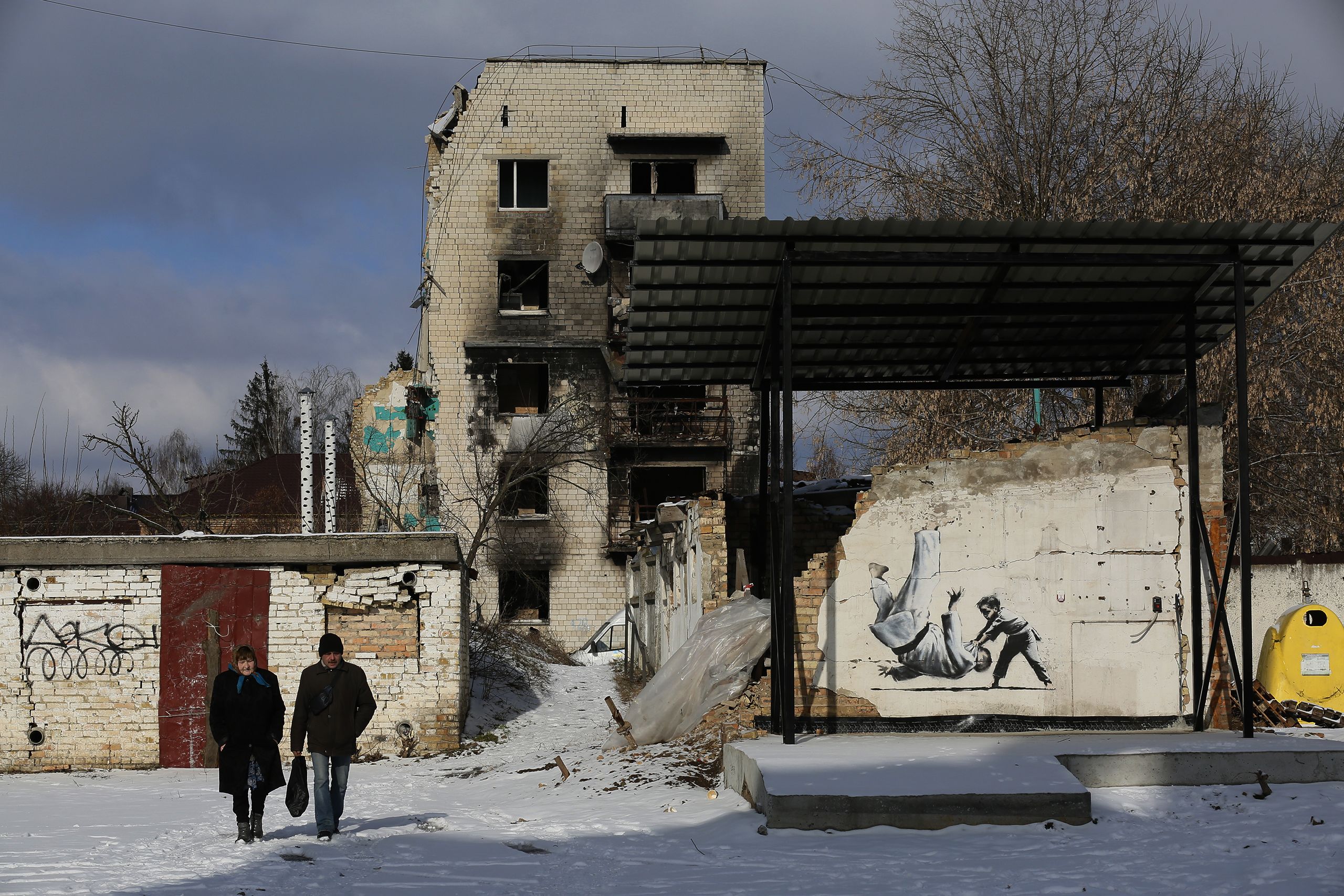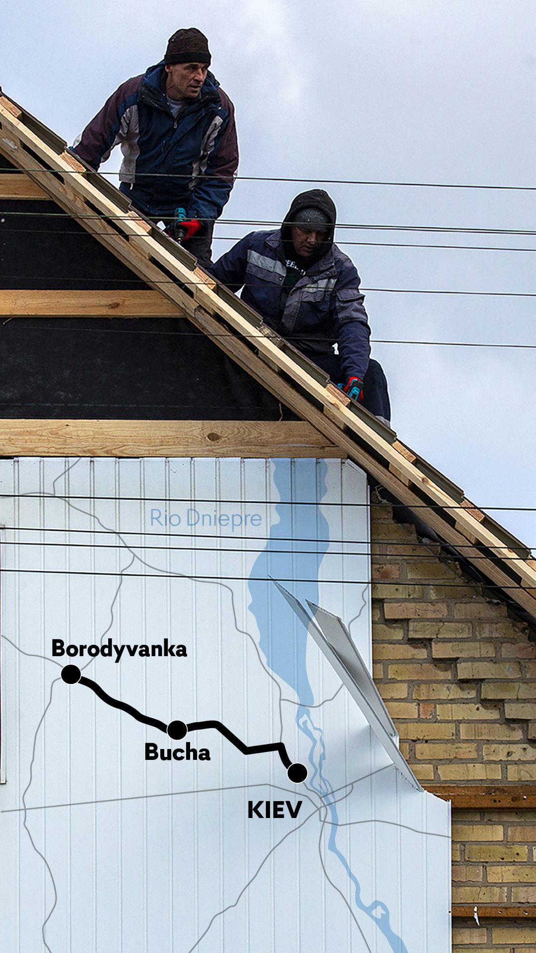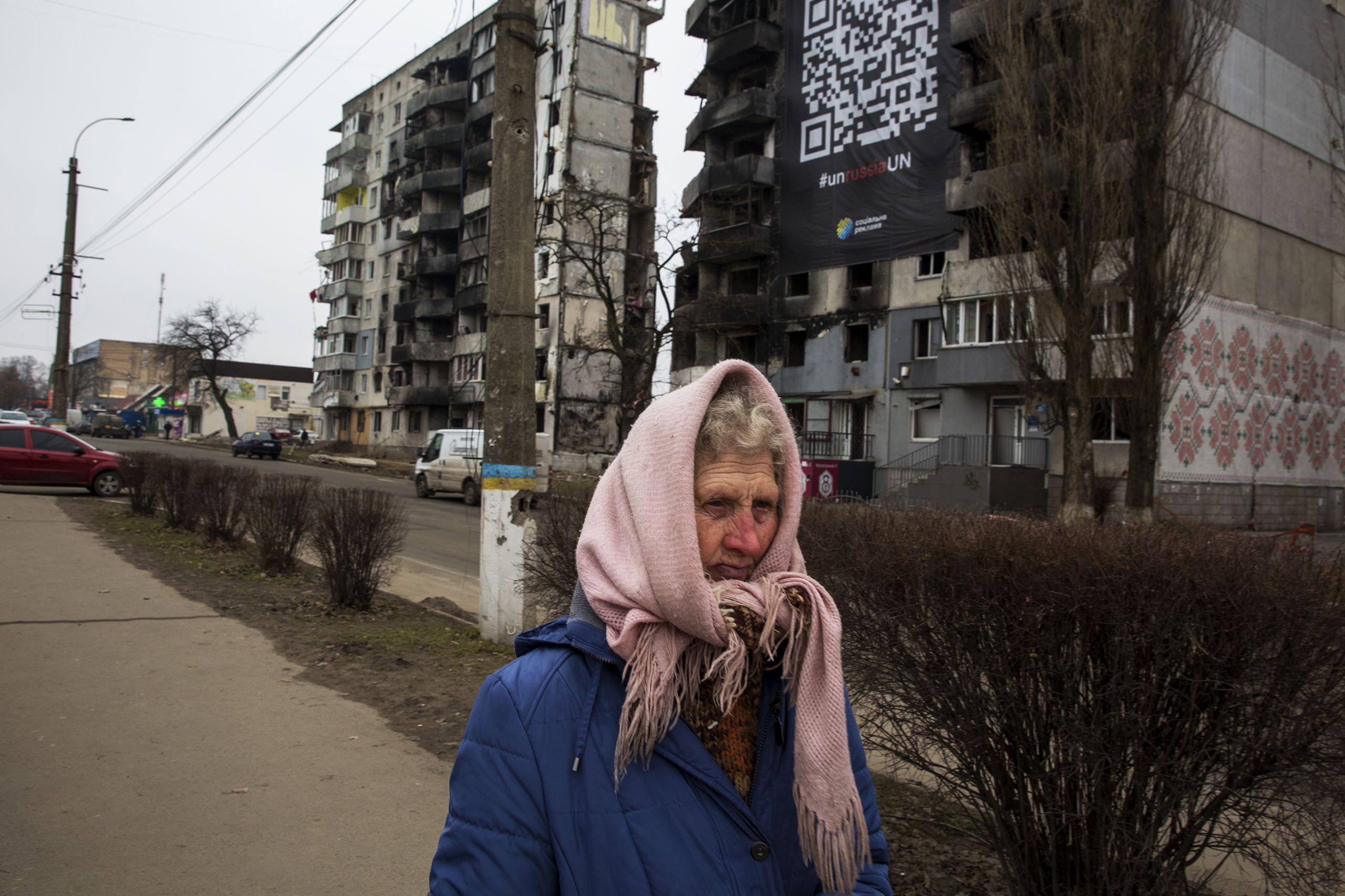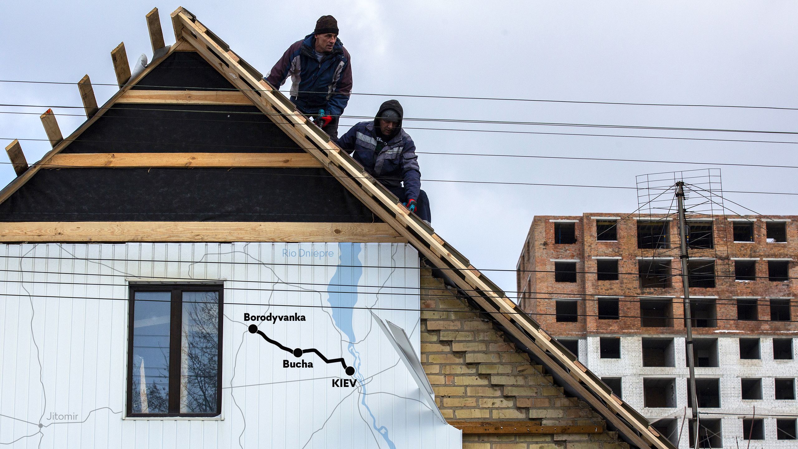 Numa esquina da rua Vokzalna, onde há menos de um ano se acumulava metal retorcido, resquícios da coluna de tanques que visava conquistar a capital, encontramos Andriy Kashperskyi, 44 anos, mecânico, a trabalhar na sua casa. A parte de cima é nova, placas de madeira comprimida mostram a geometria do passado. A família, que incluiu duas adolescentes, fugiu nos primeiros dias de guerra, porém o choque ias-lhes chegando pelas mensagens dos vizinhos que fugiram mais tarde e ainda registaram parte da ocupação. “Não vimos as atrocidades em primeira mão, mas sabemos que estiveram corpos encostados aqui ao muro, e que as pessoas que ficaram vieram buscar cobertores e roupas a nossa casa para os cobrir. Um tanque estacionou no nosso quintal, disparava contra as outras casas daqui, da nossa casa.”