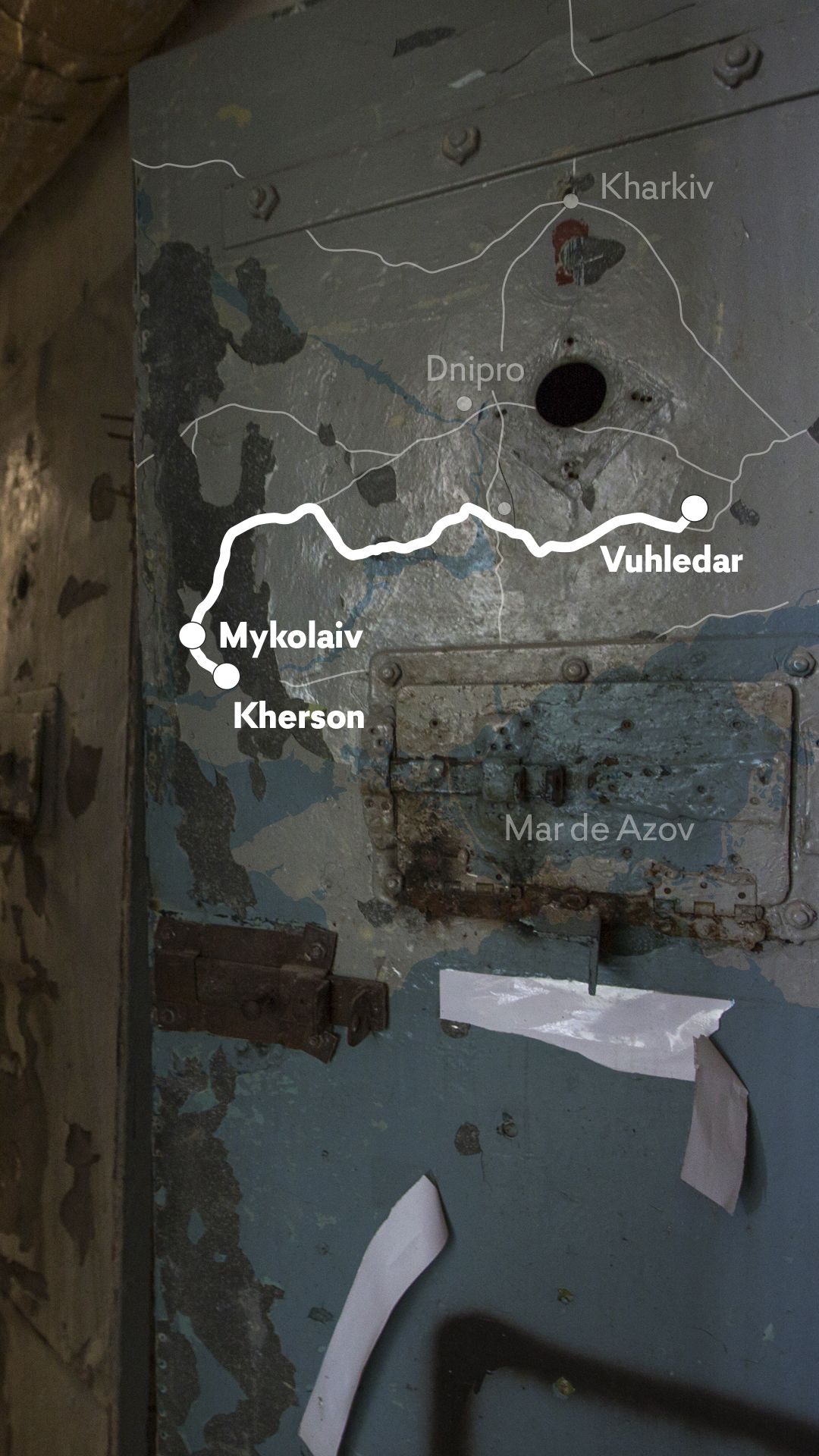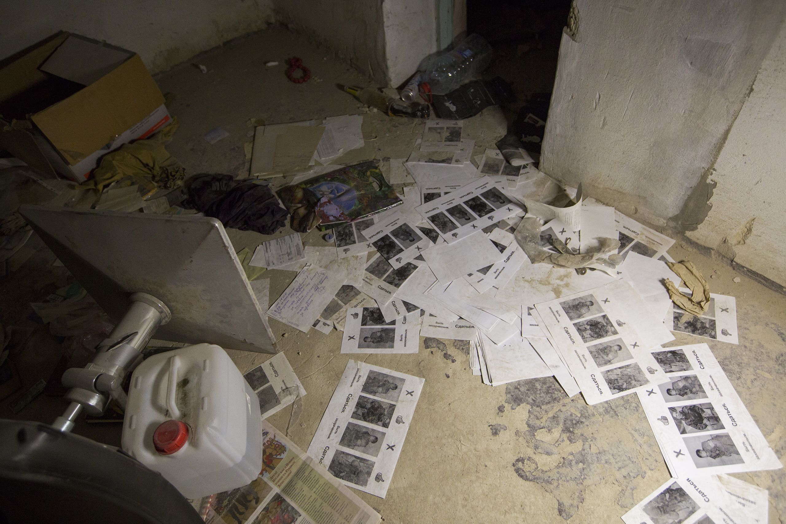 Numa das celas, onde é preciso a luz do telemóvel para ver onde pomos os pés, o chão está cheio de folhas A4 , todas com as mesmas duas imagens impressas, lado a lado: uma mostra um soldado ferido, ensaguentado; na outra vê-se o mesmo rosto já limpo, muito menos maltratado. Por baixo lê-se qualquer coisa como: “Russos, rendam-se e salvem a vossa vida”. É material que os membros da resistência ucraniana deixam nos para-brisas dos carros russos, em molhos à porta dos edifícios governamentais ocupados, nas casas de banho dos cafés e restaurantes. Andryi Kovany acredita que estas folhas foram trazidas para aqui a par com o suspeito da sua distribuição - e não tem dúvidas que a pessoa que esteve aqui presa, e que provavelmente se deitou no colchão imundo ao fundo da sala, foi torturada. “Algumas das pessoas que já testemunharam foram presas por coisas como terem uma bandeira da Ucrânia no telemóvel, ou uma fotografia dos filhos vestidos com uma camisola de futebol de uma equipa de futebol ucraniana, agora imaginem o que acontece a quem distribui material a apelar à rendição dos russos”.