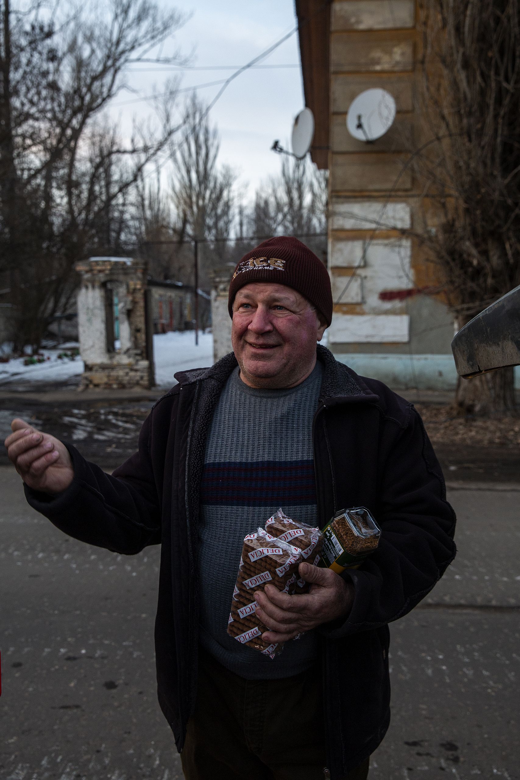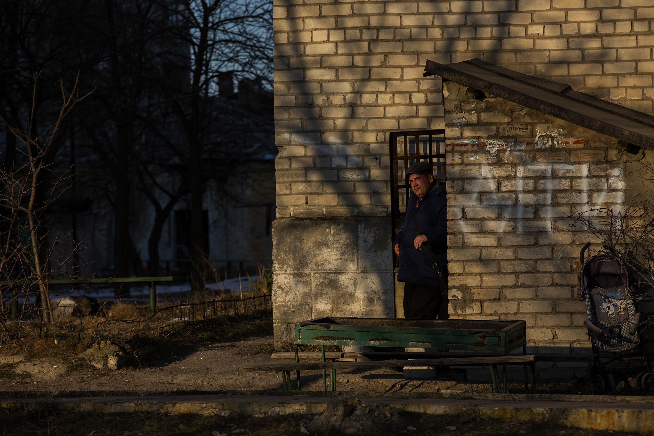 A lenha a arder nestes quatro metros quadrados gera calor opressivo, artificial. Lá fora o termómetro está sete graus abaixo de zero. Andriy traz uma boina preta de fazenda que lhe esconde um pouco o rosto. Quando dobra a pala para cima veem-se pingos de suor na testa, que limpa com a manga do casaco. Sem trabalho, distribui culpas irmãmente por todos os intervenientes na guerra que dura há quase dez anos no Donbas. “Queremos paz, mais nada, que os militares saiam, tanto os nossos como os deles. Vivíamos e trabalhávamos em paz, a estação era a vida desta cidade, agora os carris estão partidos. Trabalho, paz, silêncio, não precisamos de mais nada. Só peço que ninguém atire sobre as nossas casas e que…”