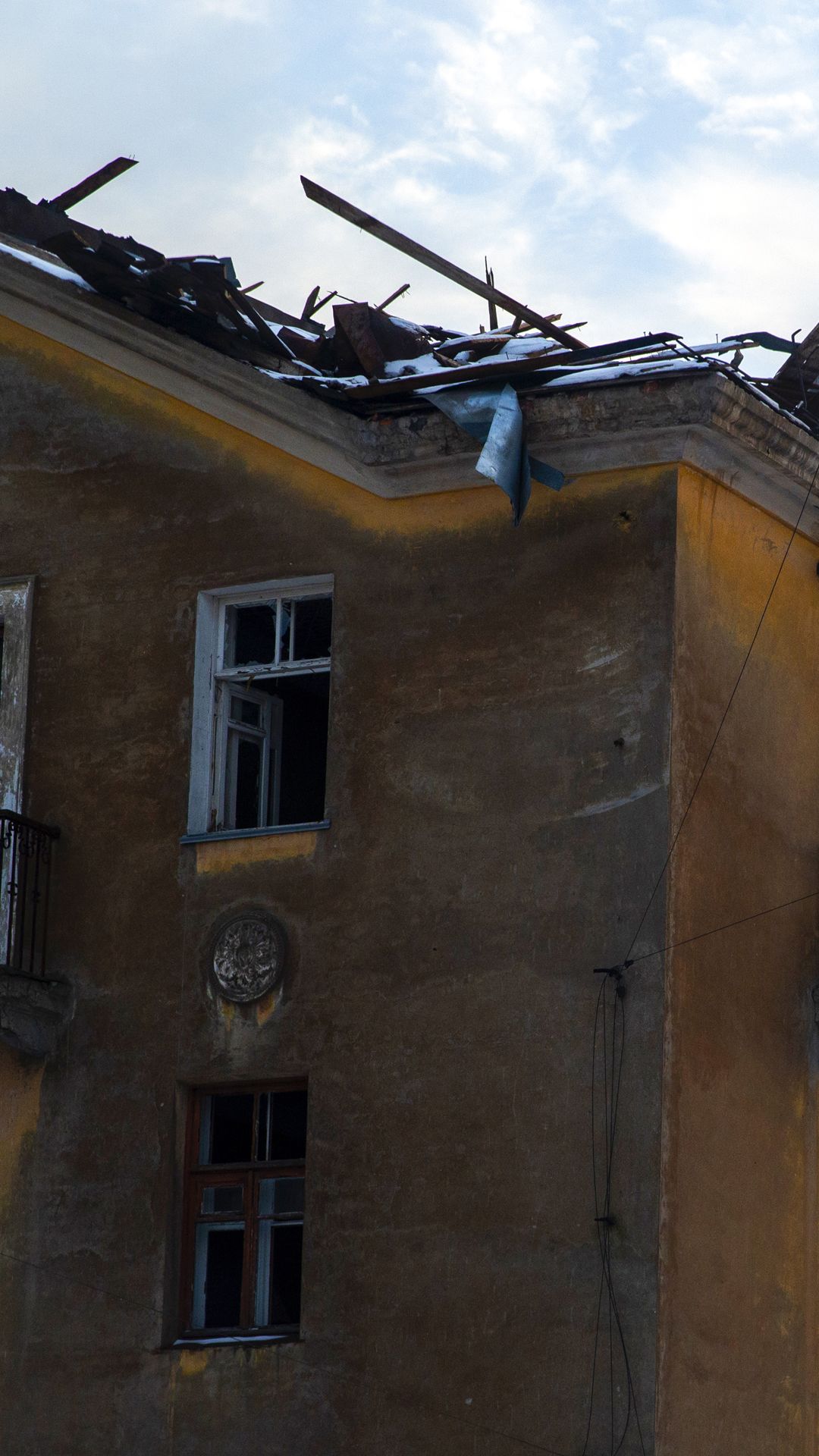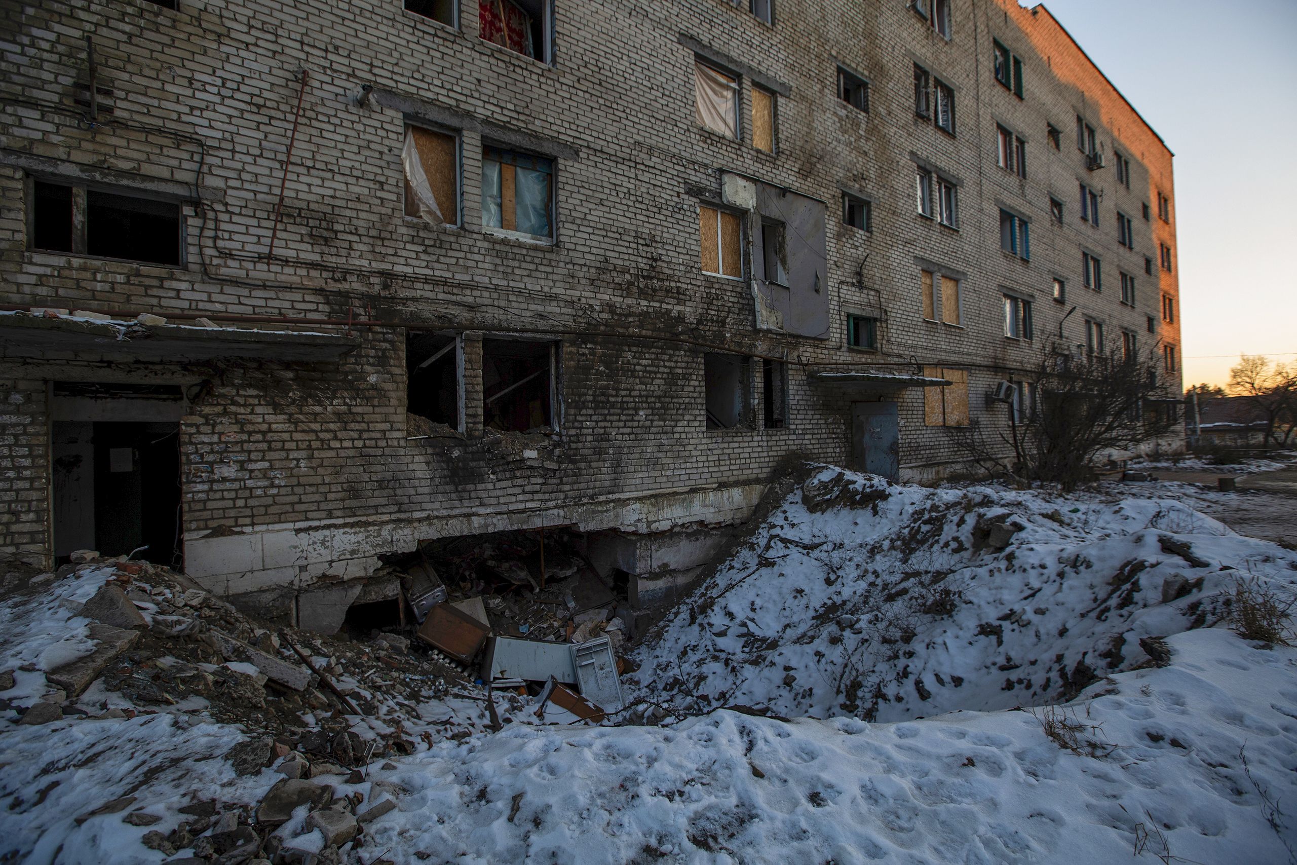 A noite cai de uma vez, mas Lyubov ainda quer mostrar o que resta do seu apartamento. Sobe as escadas do abrigo, dobra a esquina e aponta para cima. Era um prédio de cinco andares, o seu é o que falta. Ficaram duas ou três paredes enegrecidas, as ruínas recortam o pôr-do-sol, laranja como a lava. Despede-se, tem de ir aquecer água num tacho para tomar banho e só há um fogão, com um bico, para as cinco pessoas que aqui vivem. “Ao menos durmo bem, já não vêm os russos com espingardas pedir os documentos às duas, três, quatro da manhã.”