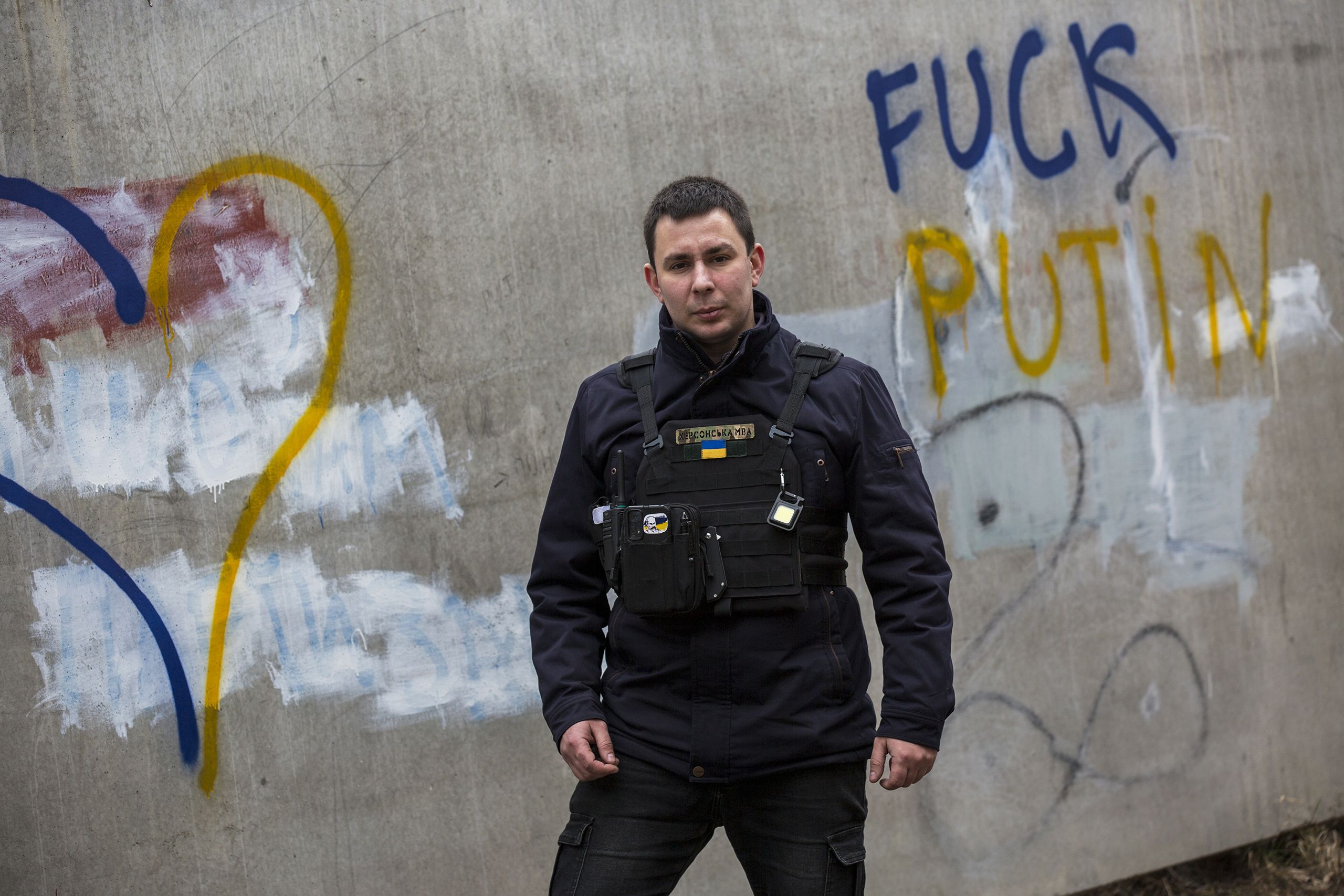 Começamos a caminhar pelas ruas, através do itinerário que Andriy tem na cabeça. As razões por que foi preso estão espalhadas pelas paredes: “Fuck Putin”, “Tudo é Ucrânia”, “Fuck Russia”, “Kherson nunca vai ser vosso”. Foi ele que grafitou tudo.