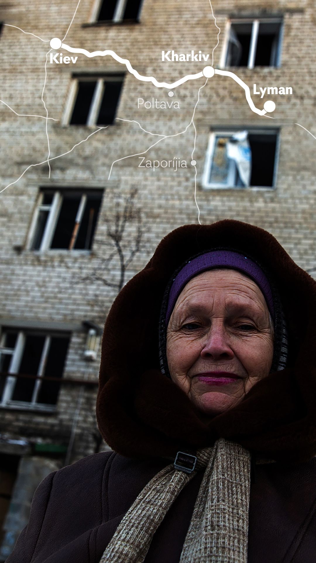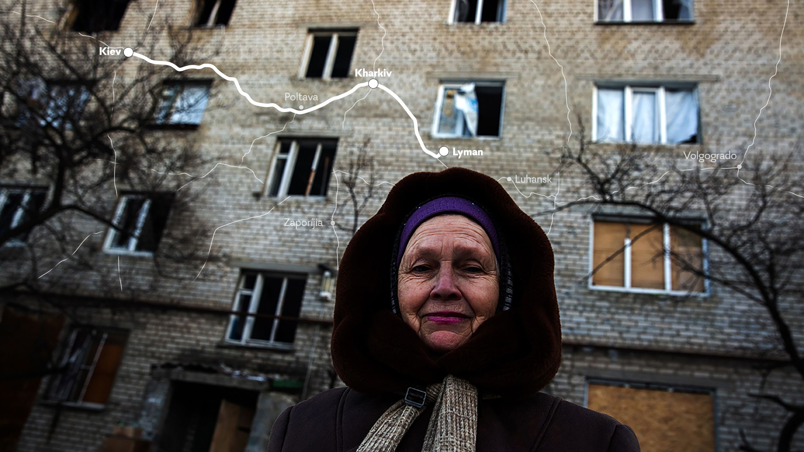 É preciso dormir antes da viagem para leste. As distâncias entre as principais cidades são colossais. O destino final é Kramatorsk. Vamos pela estrada que une as terras de novo sob controlo ucraniano. Passamos por Sumy, pelos arredores de Kharkiv, descemos por Kupiansk, Izium e paramos em Lyman, distrito de Donetsk, no leste eternamente exposto. Halyna e Natalia, amigas de 62 anos, saíram há pouco do abrigo para apanhar ar.