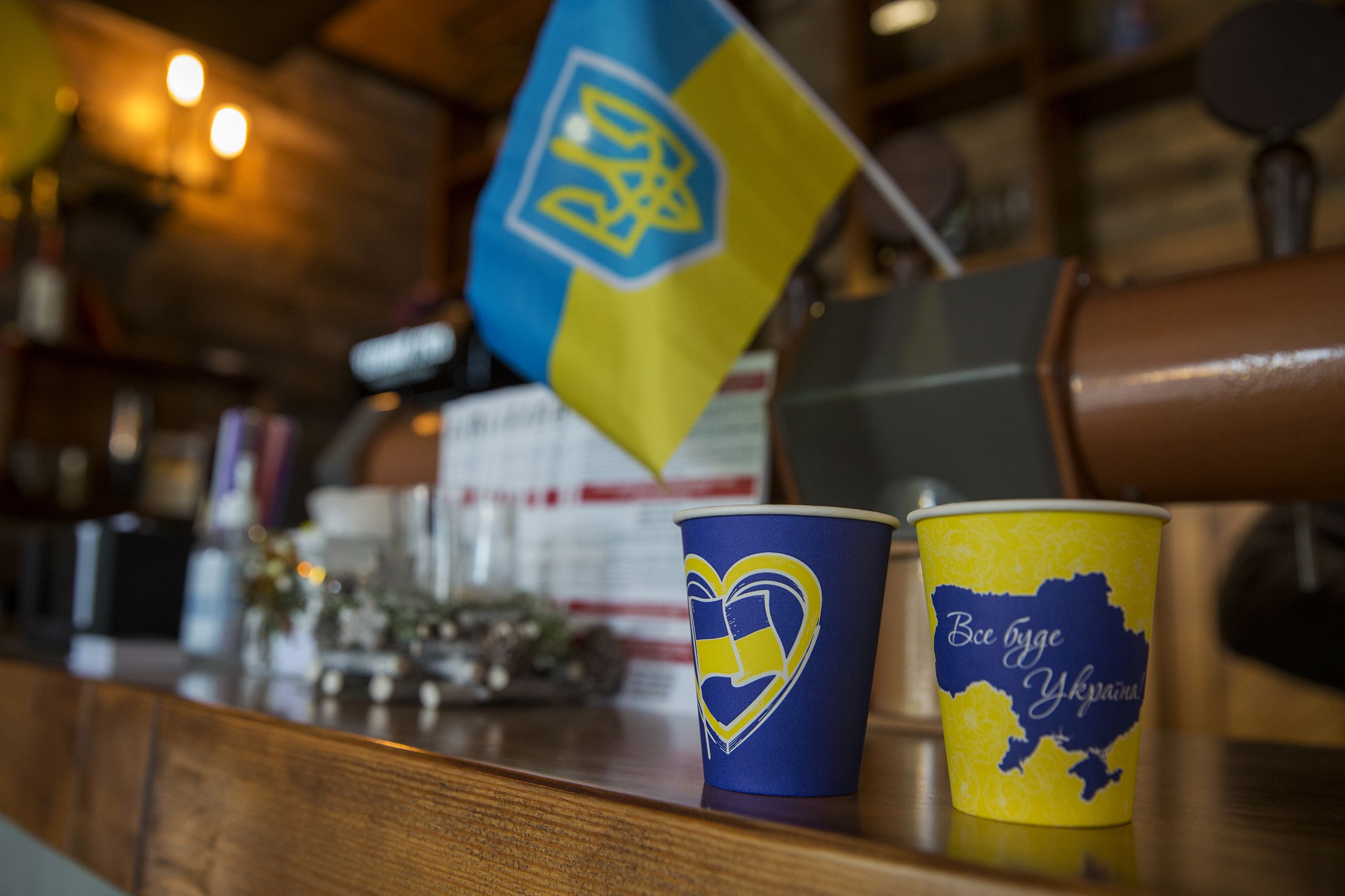 Espera o Expresso à frente do café Pato Negro, onde muitos membros da resistência se encontravam durante a ocupação. O dono, “Vova”, continua com medo dos informadores e não se alonga quando pedimos um café para o caminho. “Sim, era um sítio seguro para todos os partisans, mas os russos estão mesmo do outro lado do rio, temos informadores e não quero um alvo por cima do meu café.” Vai para a cozinha. Os pequenos copos azuis e amarelos em que serviu o café, alegando não ter outros quando os russos rejeitavam aqueles, estão em exposição em cima do balcão. “Tudo será Ucrânia”, lê-se por baixo de um mapa que inclui os contornos da Crimeia e do Donbas.