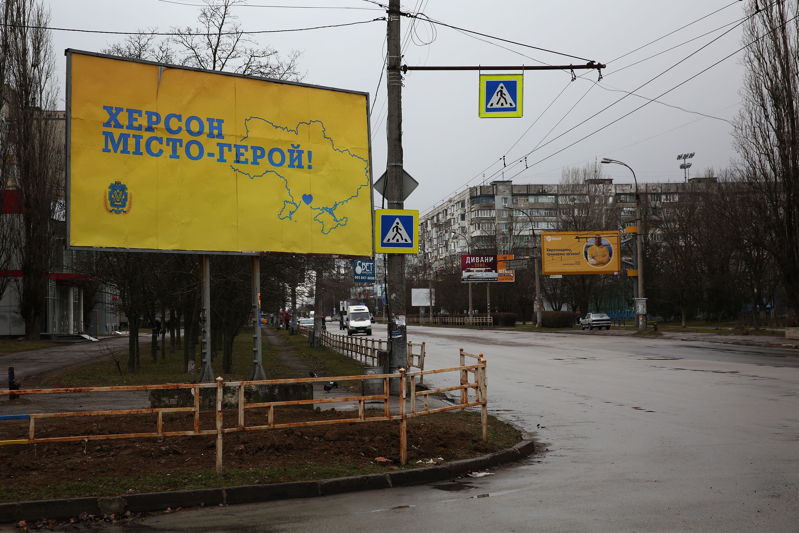 O som dos morteiros a cair nos arredores da cidade é constante. Por vezes caem no centro. Na véspera de Natal morreram 10 pessoas. O exército russo foi expulso para o outro lado do Dniepre, por lá ficou, a aterrorizar esta margem com ataques aleatórios de atiradores ou chuva de morteiros sem alvos específicos. Quinze dias depois da libertação da cidade já tinham morrido 30 pessoas em bombardeamentos vindos do outro lado. A contagem ultrapassa agora as cem vítimas. No fim de uma hora de disparos começam a passar ambulâncias na rua principal, sem sirene, mas a derrapar nas curvas. Não há fogo de artifício na Ucrânia nem sirenes nas ambulâncias, não é permitido emitir sons parecidos com os da guerra.