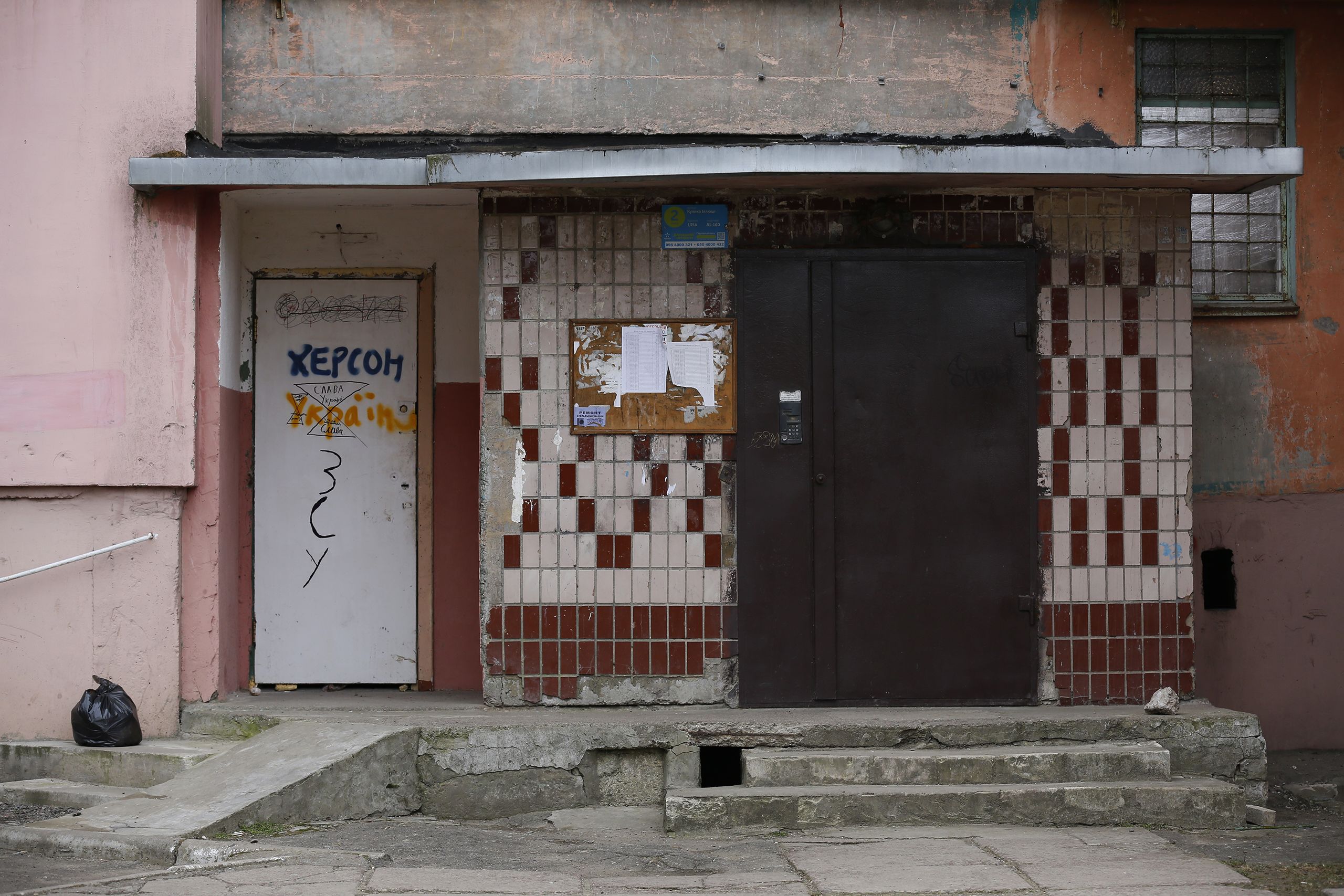 “Ali, naquele prédio, veem? Escrevi ‘Slava Ukraini’ com a palavra ‘Slava’ por cima e ‘Ukraini’ por baixo, em vez de numa mesma linha. Quer dizer que aqui vivia um colaboracionista, avisa as pessoas do prédio de que devem ter cuidado com o que dizem aos vizinhos”, diz Andriy. Antes da ocupação, começou a abastecer a sua casa de coisas de que poderia vir a precisar para resistir. Os russos entraram em Kherson pela Crimeia a 25 de fevereiro. A 2 de março tinham conquistado a cidade. A resistência militar quase não se fez sentir. “Ficámos nós, os civis. O exército fez uma opção estratégica de retirada, para depois atacar com mais força, mas eu, se saísse, sentir-me-ia como se tivesse capitulado, e sei que muitos companheiros sentiam o mesmo.”