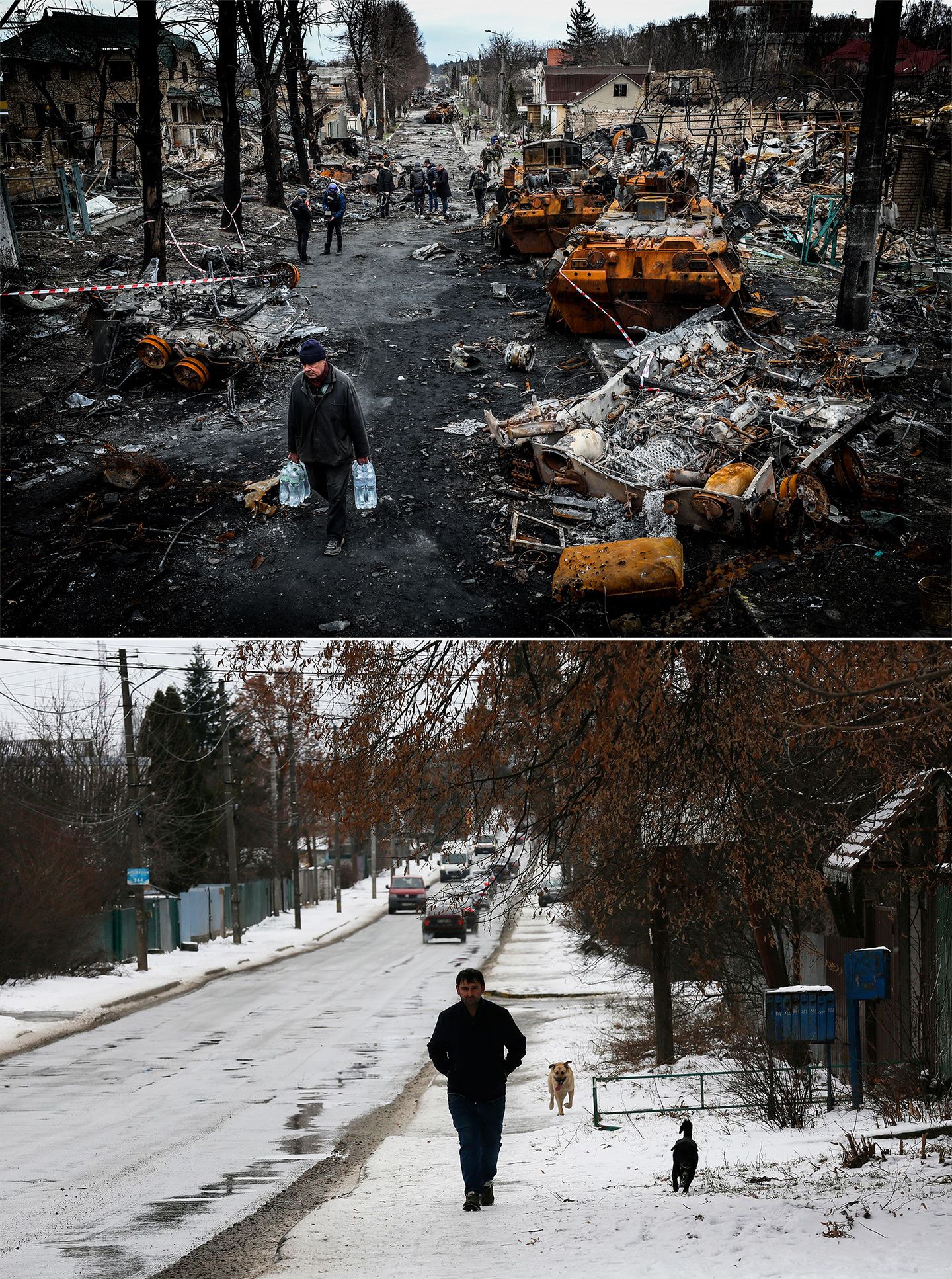 Rua Vokzalna em abril de 2022 (em cima, fotografia de Rui Duarte Silva) e em fevereiro de 2023 (em baixo, fotografia de Ana Baião)
