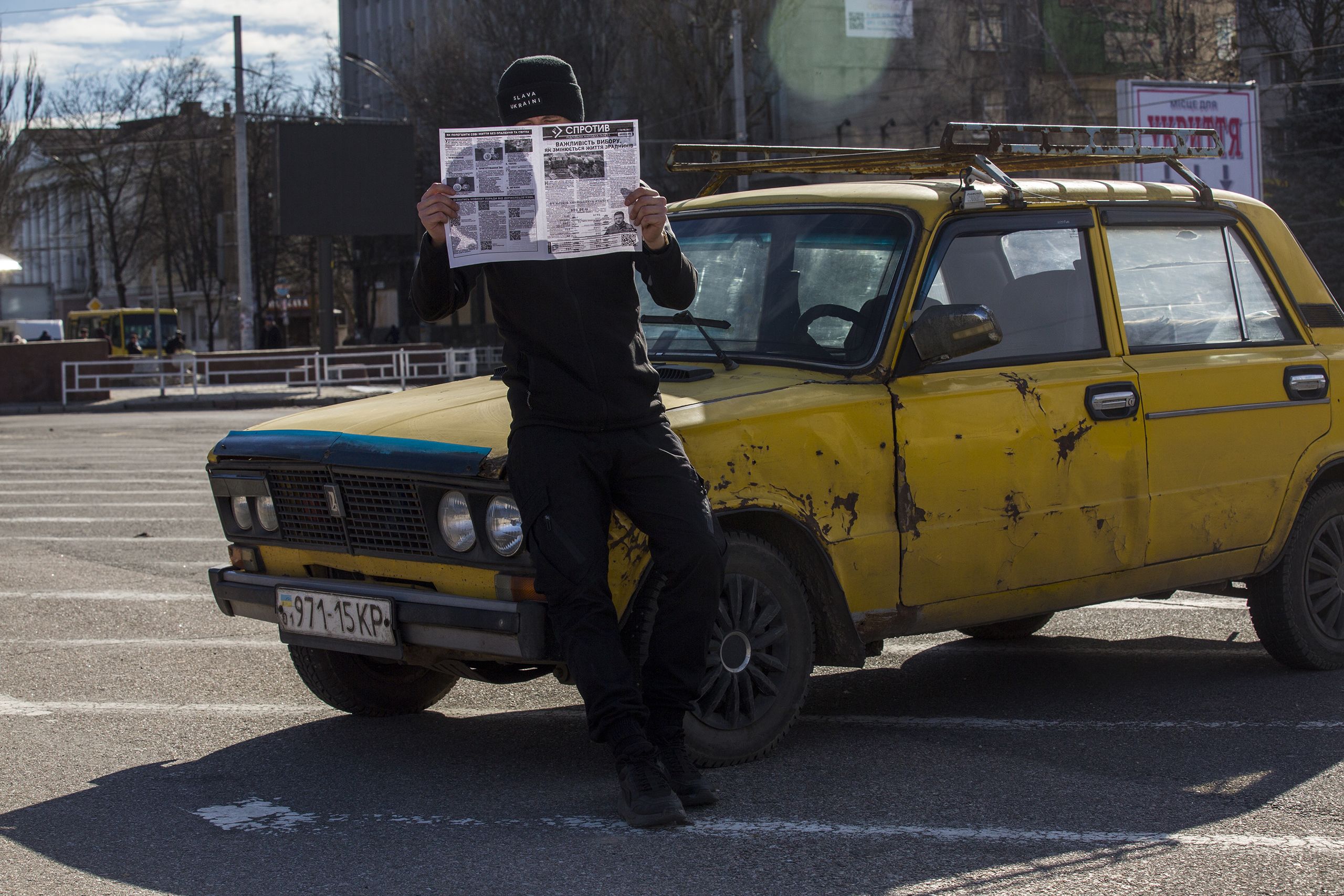 Viramos uma esquina e aparece um “Z”, símbolo do exército russo, com spray amarelo e azul por cima, obra de Lilia. “Sabia que era importante os cidadãos acordarem e verem mais laços, mais mensagens”. Tanto Lilia como Andriy estiveram nas manifestações contra a ocupação russa, nos primeiros dias, na praça principal. Ele pôs uma bandeira da Ucrânia sobre o canhão de um tanque russo, ela e a filha embrulharam-se na bandeira. Aos poucos, os manifestantes começaram a desaparecer, a Internet foi cortada, mesmo com cartões SIM de empresas russas a ligação nunca era certa. Aos poucos, as pessoas foram perdendo acesso a fontes livres de informação.