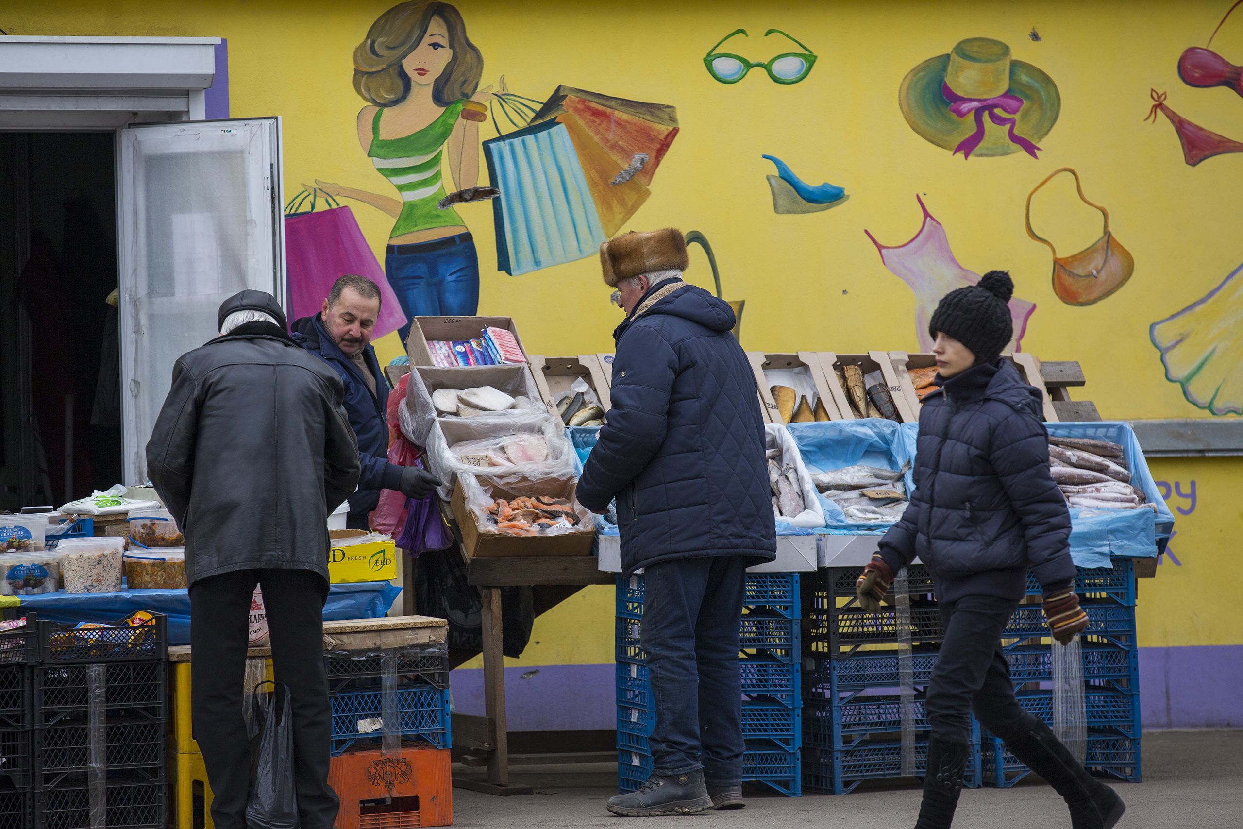 Na praça principal de Borodyanka há mais movimento. Num pequeno mercado as pessoas compram fruta, pão, cereais secos, feijão, legumes, há uma ala com tecidos para casa, toalhas de banho, toalhas de mesa, outra com calçado e roupa, incluindo lingerie, vestidos de verão, collants com brilhantes. Há ainda uma banca de utensílios essenciais para militares, negócio que vinga até nas mais isoladas aldeias: canivetes suíços, mochilas com fitas de velcro onde prender emblemas, e os próprios emblemas, dos “clássicos” com a bandeira da Ucrânia e o símbolo das forças armadas aos mais específicos, com grupos sanguíneos, botas quentes, balaclavas, camisolas de lã, golas de tecido polar, tudo verde-tropa.